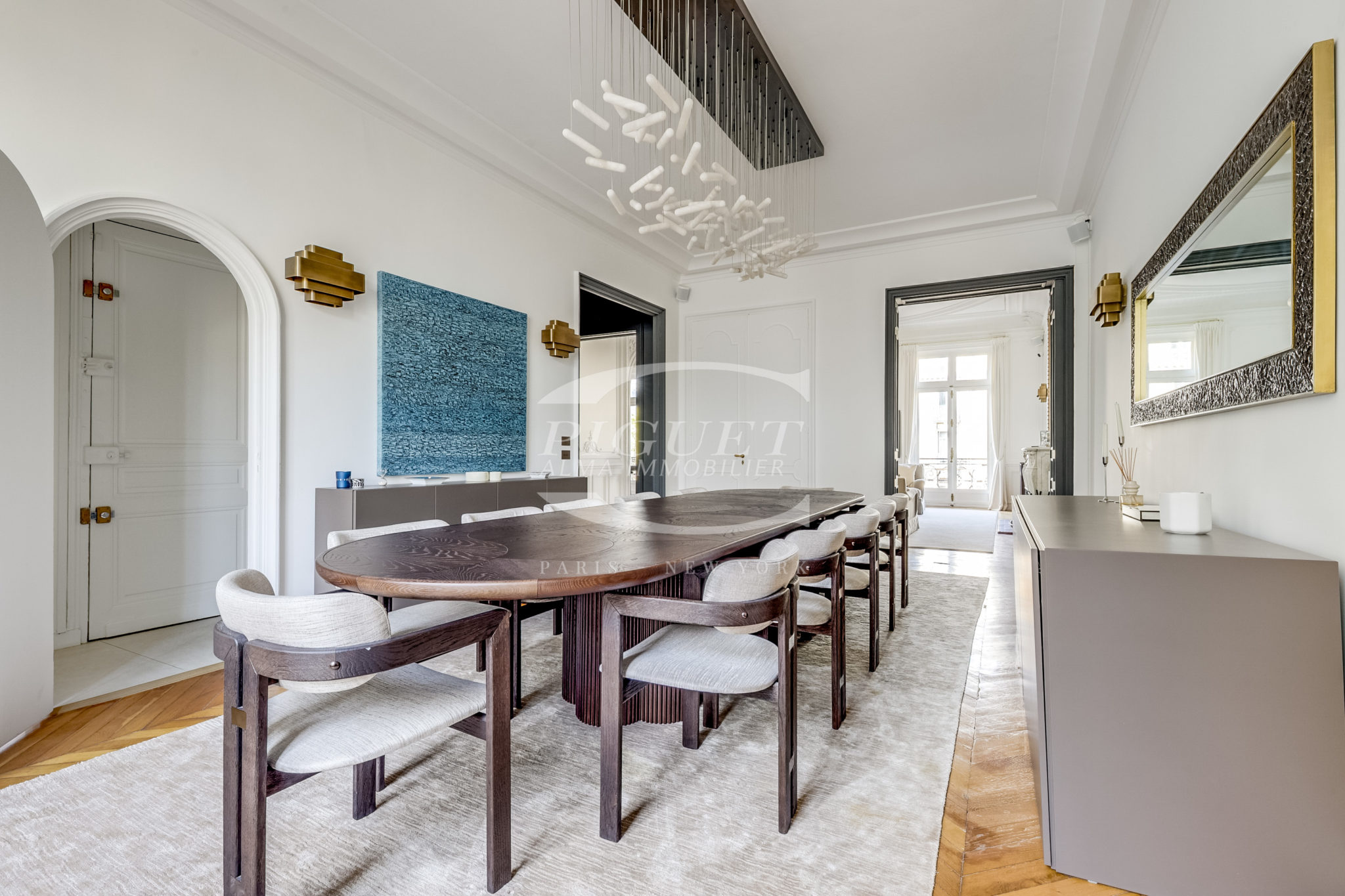 Catherine PIGUET invites you to discover in the heart of the golden triangle, a magnificent reception apartment with 3m50 high ceilings located on the 3rd floor of a luxury freestone building, facing south/west without vis-à-vis with an exceptional view of the Eiffel Tower. The apartment has been completely restored in a contemporary style, parquet flooring, moldings and fireplace.