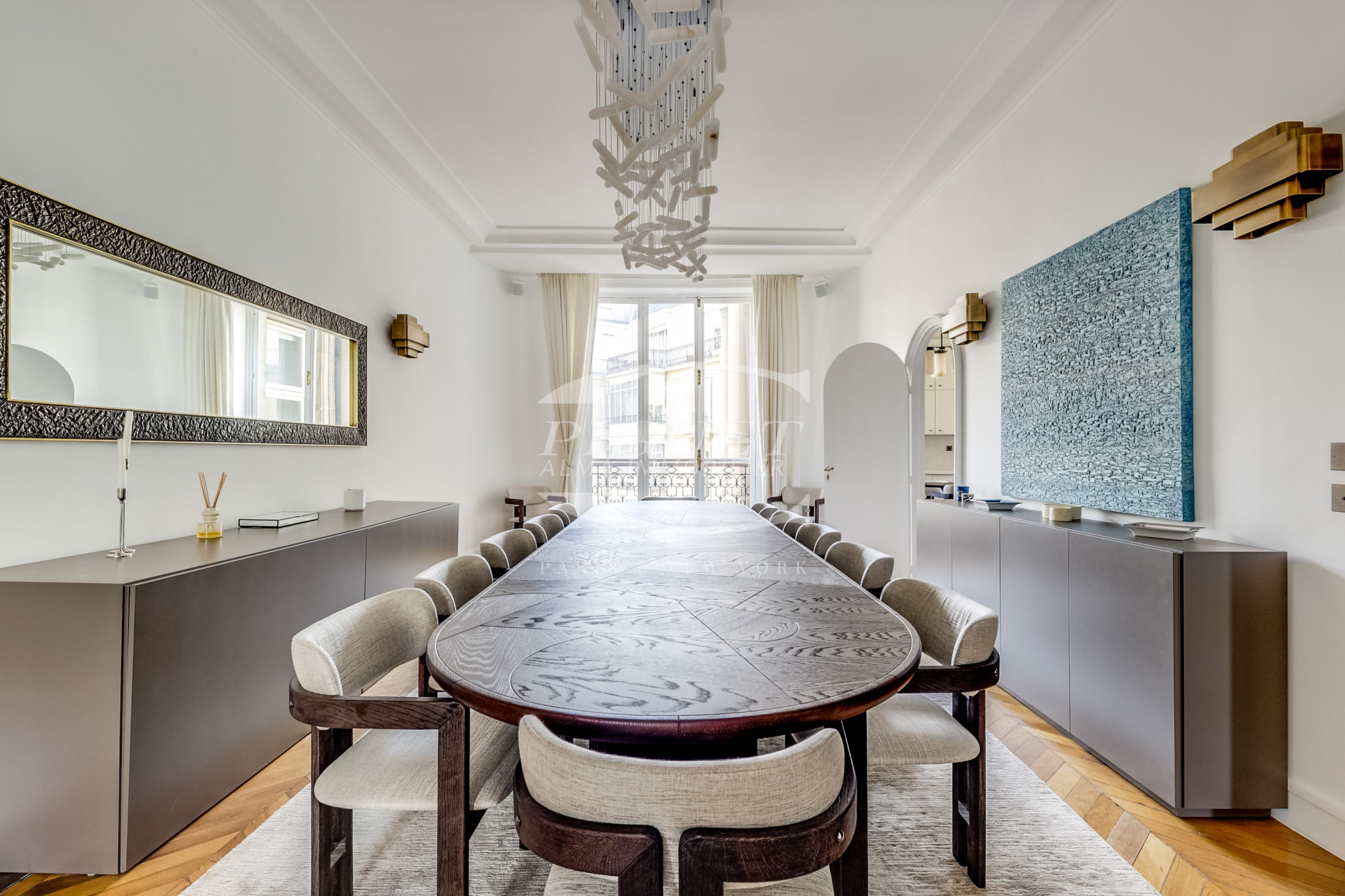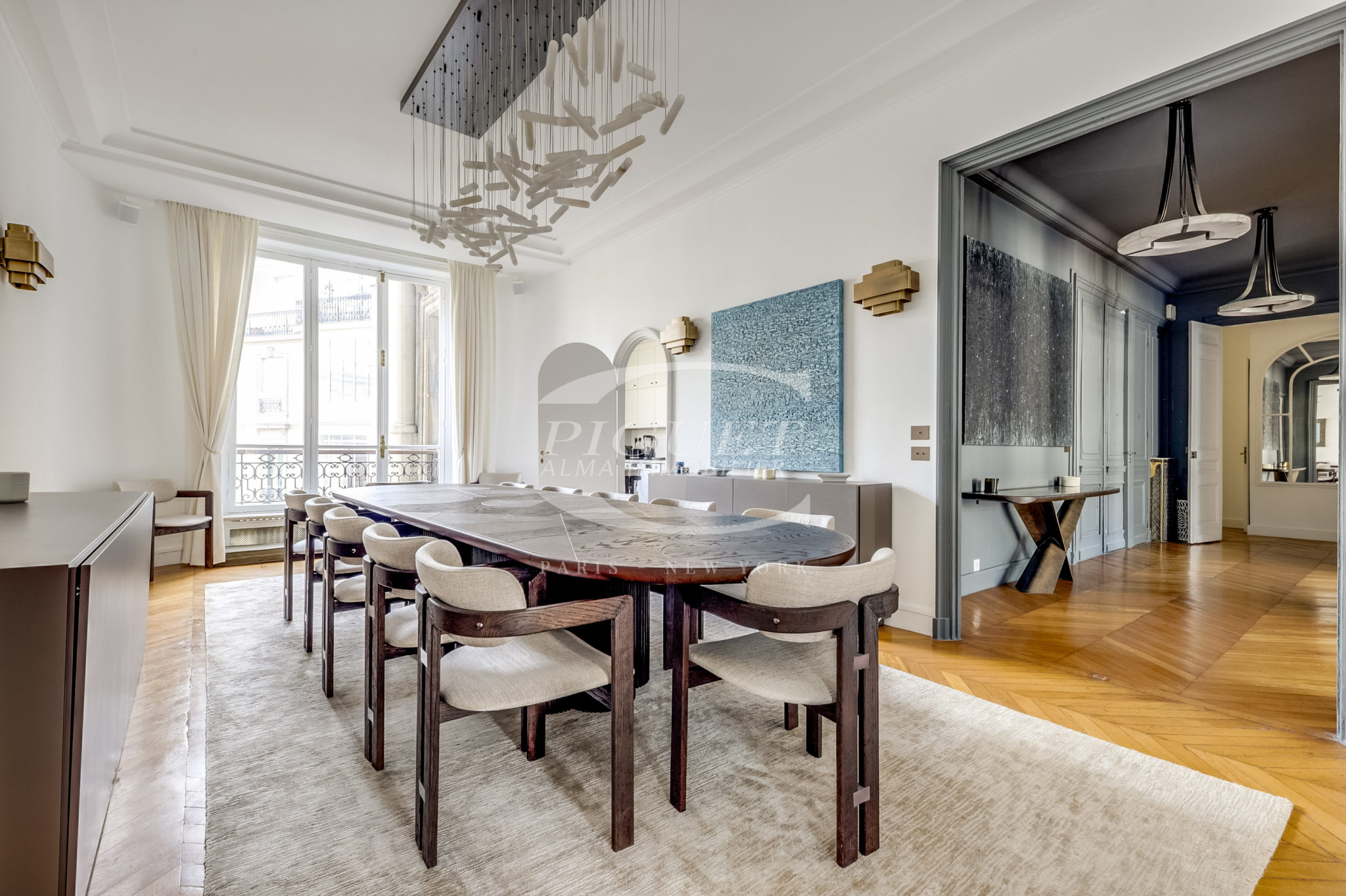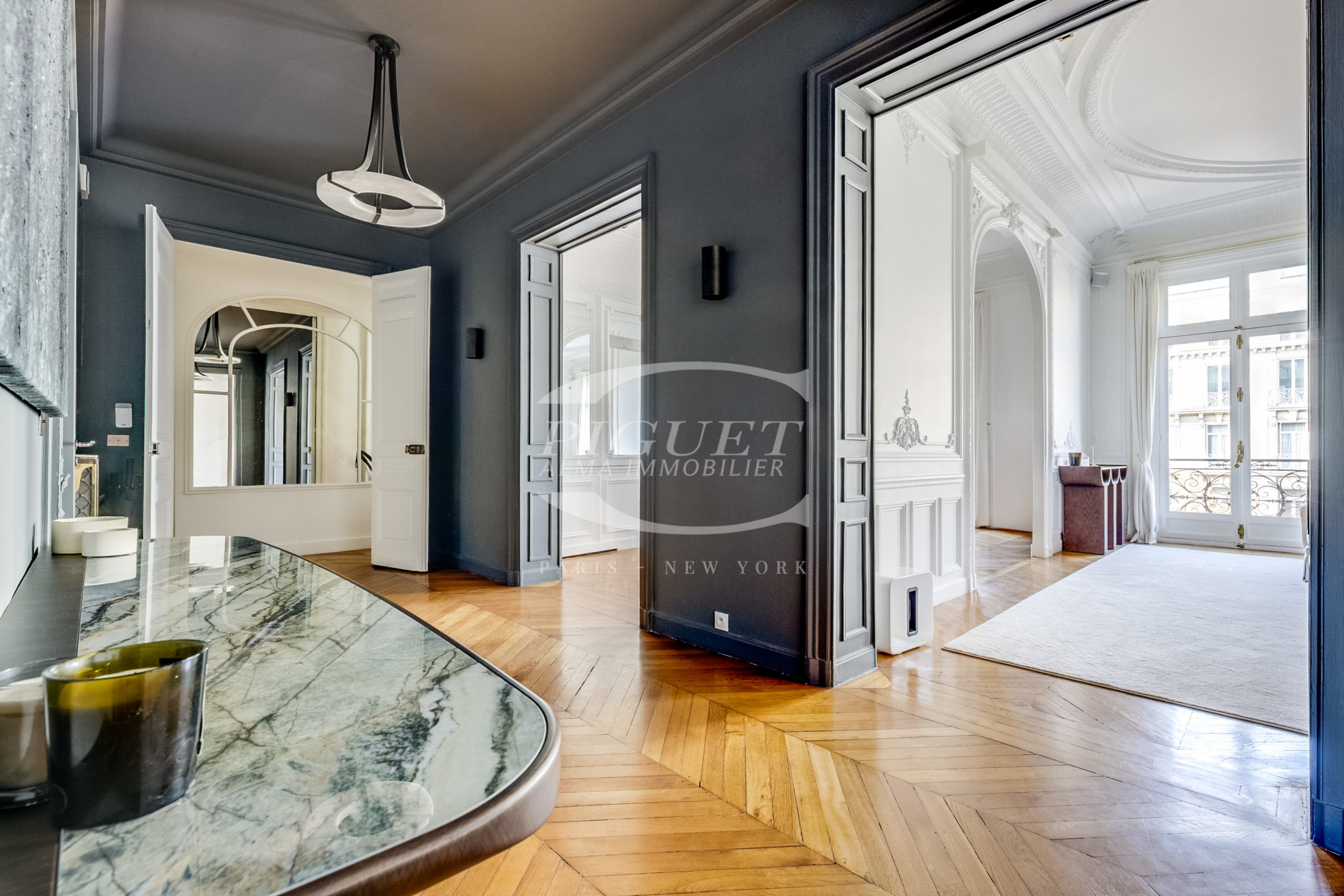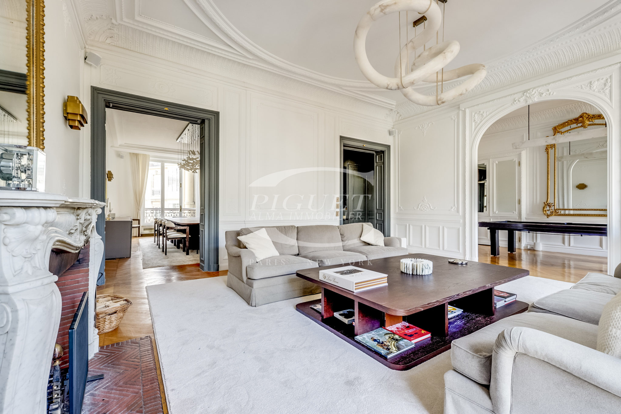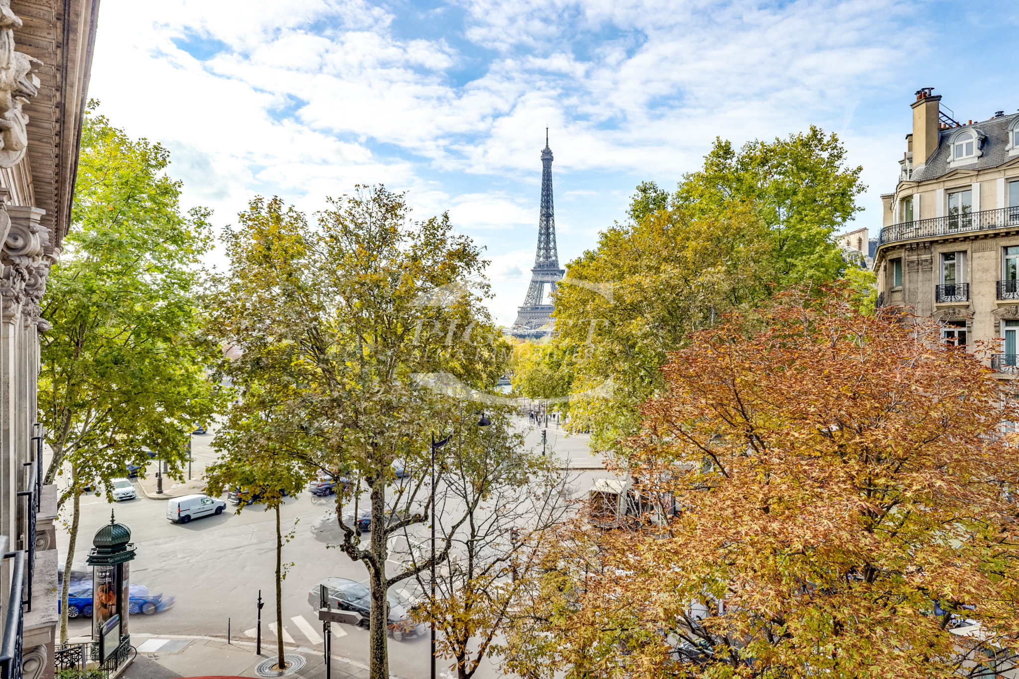 Catherine PIGUET invites you to discover in the heart of the golden triangle, a magnificent reception apartment with 3m50 high ceilings located on the 3rd floor of a luxury freestone building, facing south/west without vis-à-vis with an exceptional view of the Eiffel Tower. The apartment has been completely restored in a contemporary style, parquet flooring, moldings and fireplace.