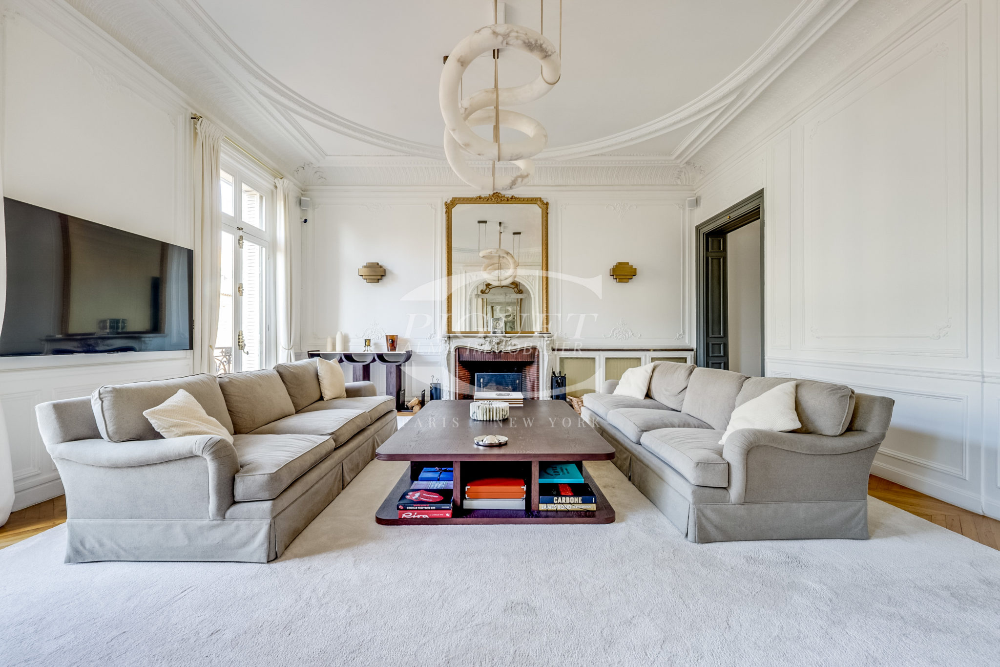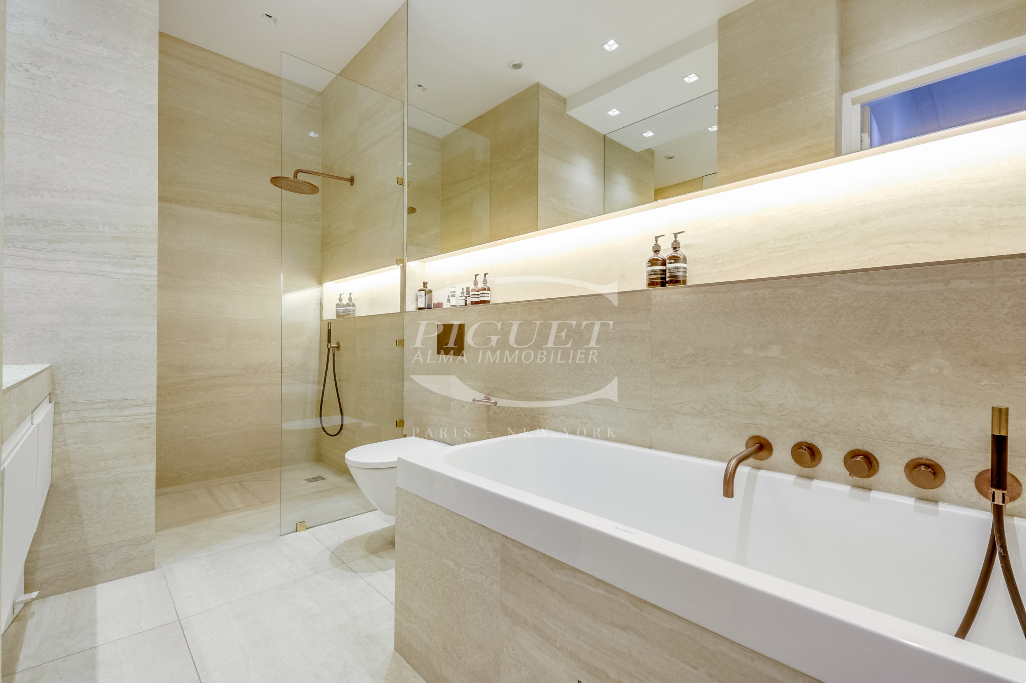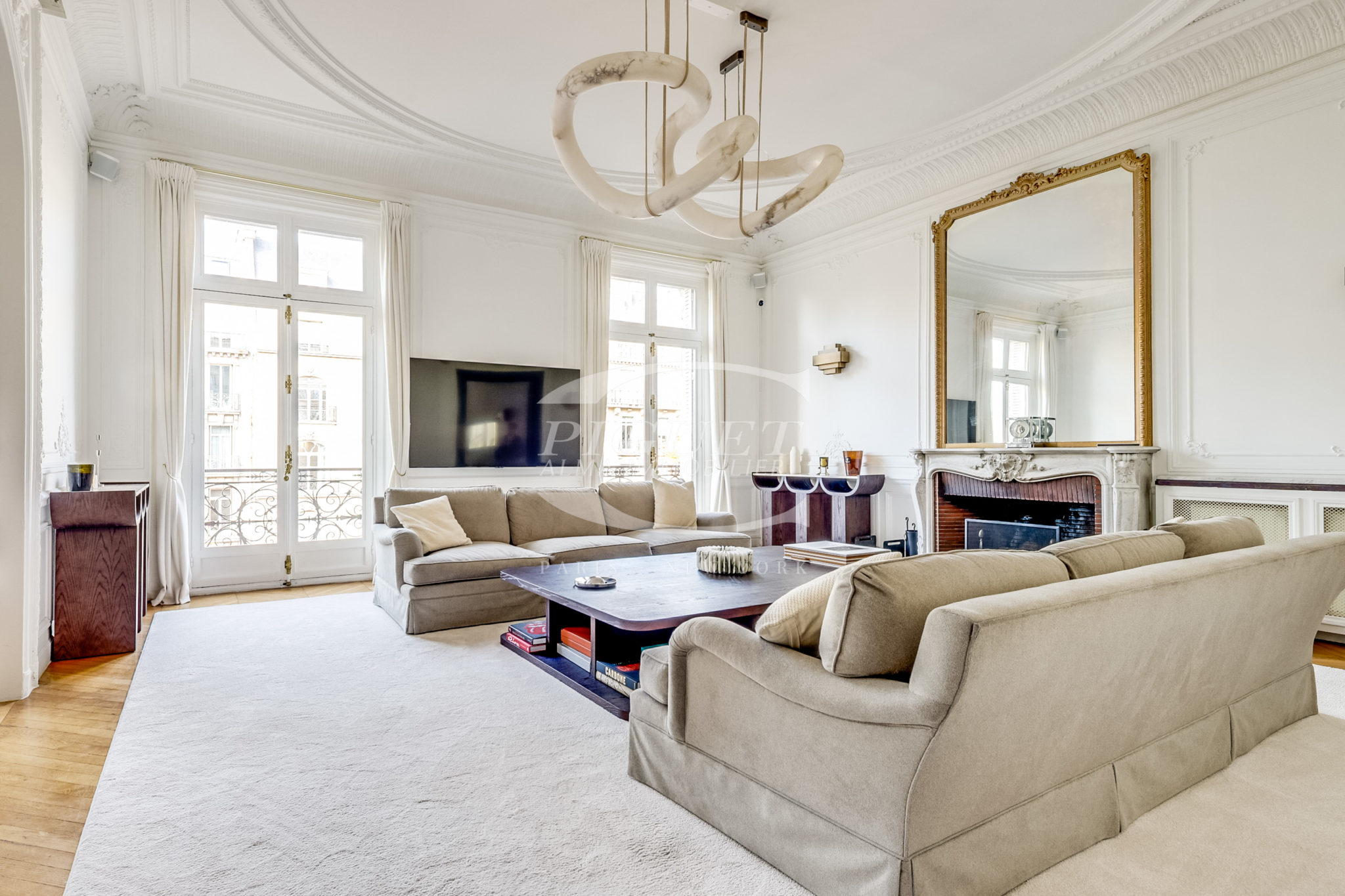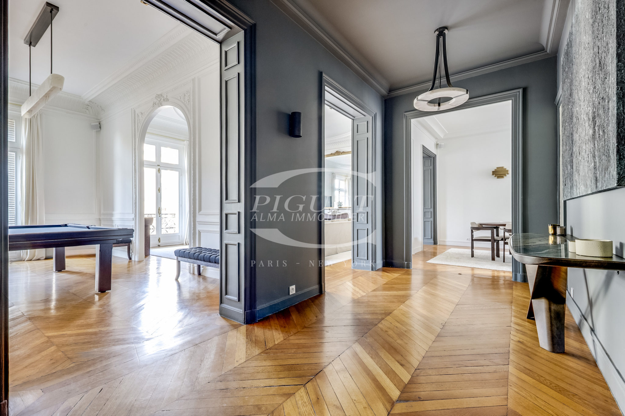Catherine PIGUET invites you to discover in the heart of the golden triangle, a magnificent reception apartment with 3m50 high ceilings located on the 3rd floor of a luxury freestone building, facing south/west without vis-à-vis with an exceptional view of the Eiffel Tower. The apartment has been completely restored in a contemporary style, parquet flooring, moldings and fireplace.