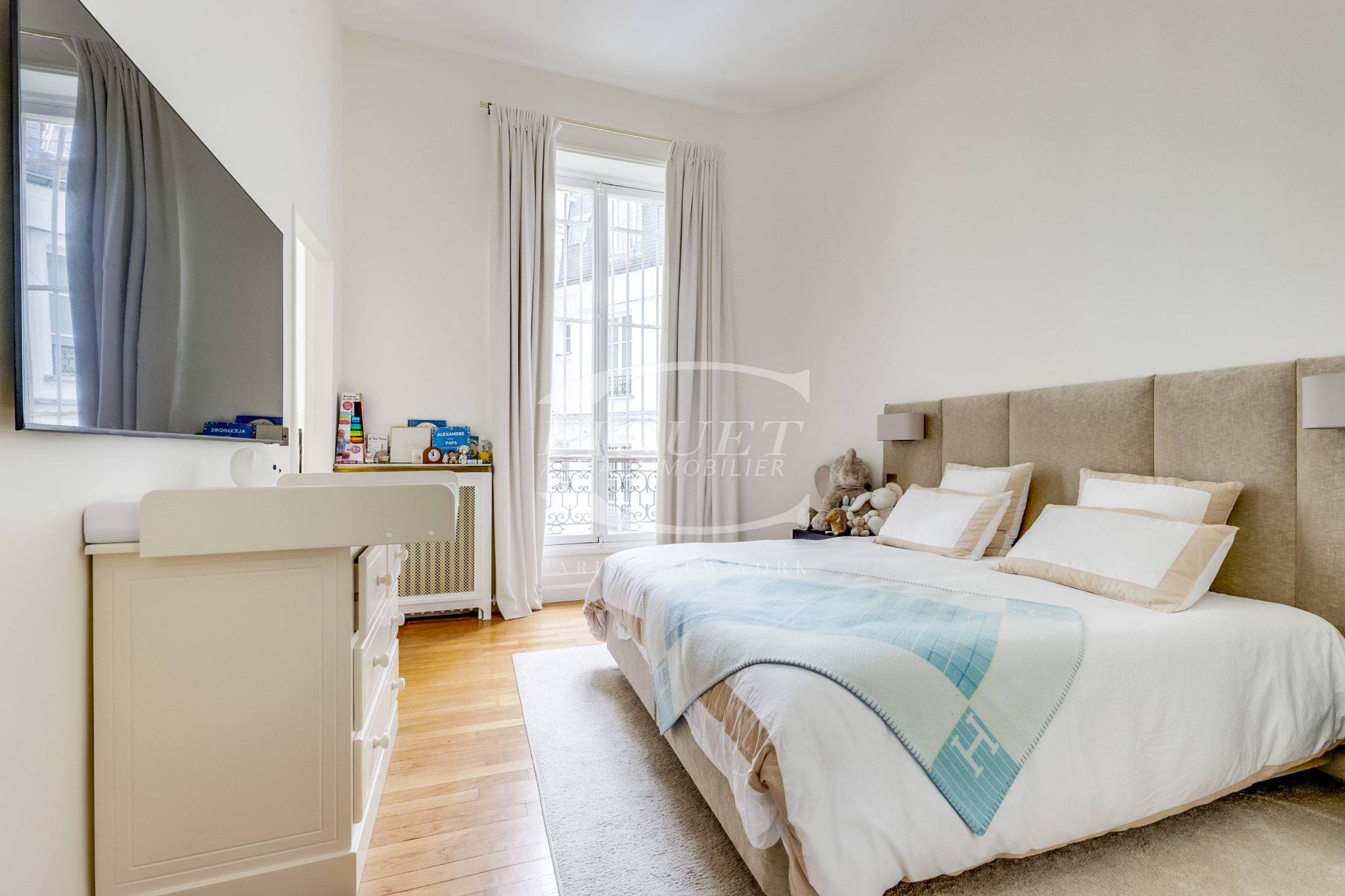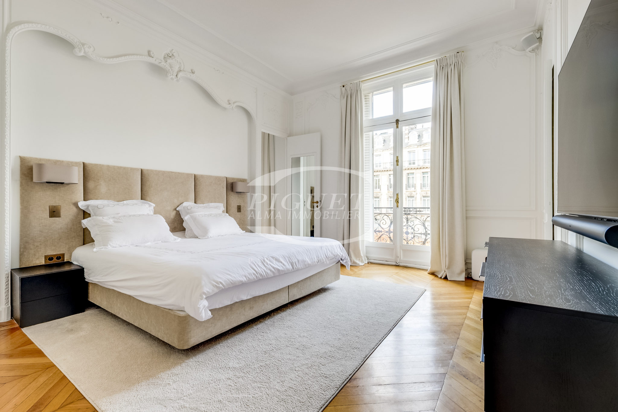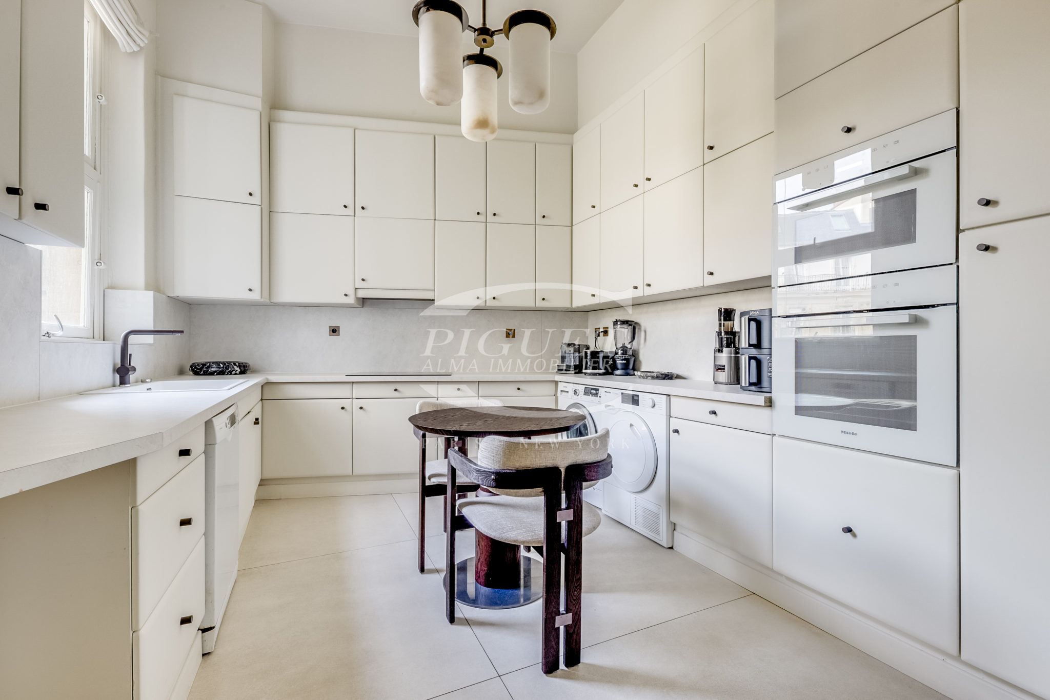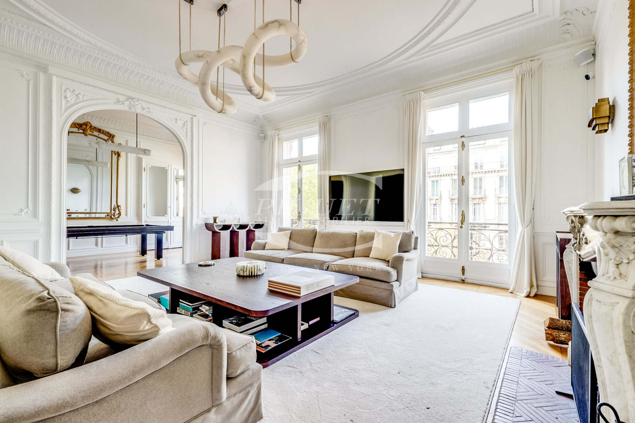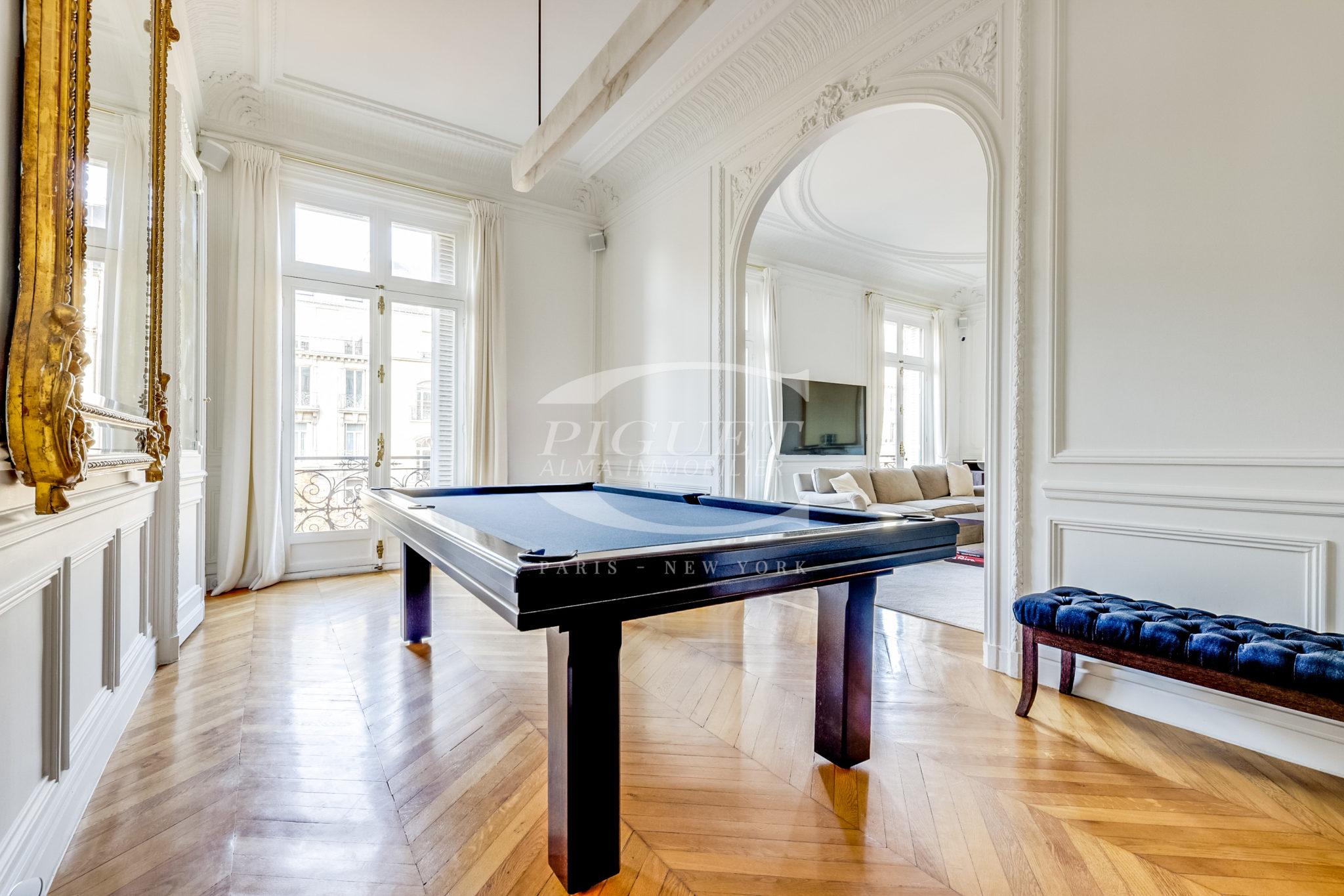 Catherine PIGUET invites you to discover in the heart of the golden triangle, a magnificent reception apartment with 3m50 high ceilings located on the 3rd floor of a luxury freestone building, facing south/west without vis-à-vis with an exceptional view of the Eiffel Tower. The apartment has been completely restored in a contemporary style, parquet flooring, moldings and fireplace.