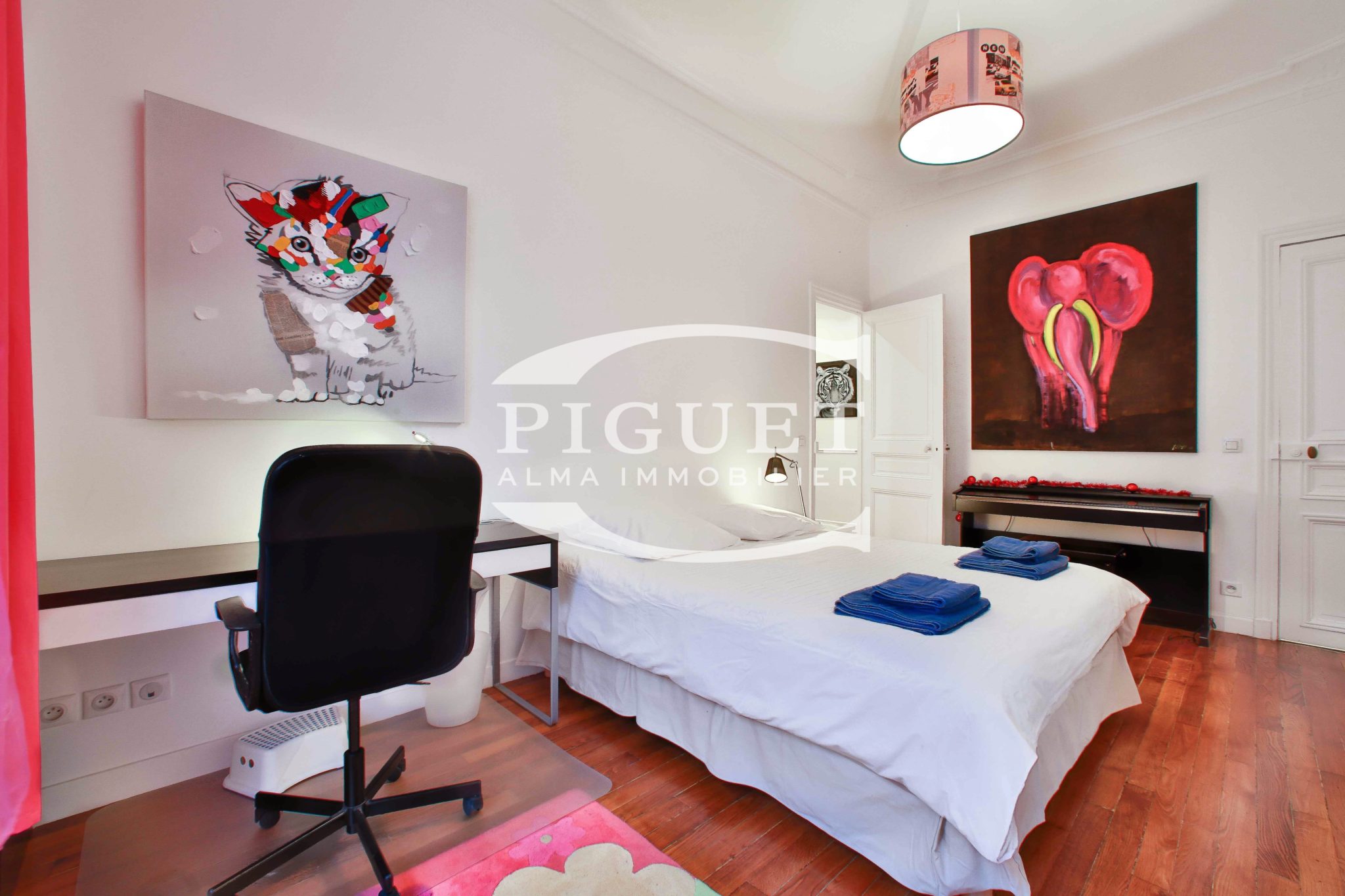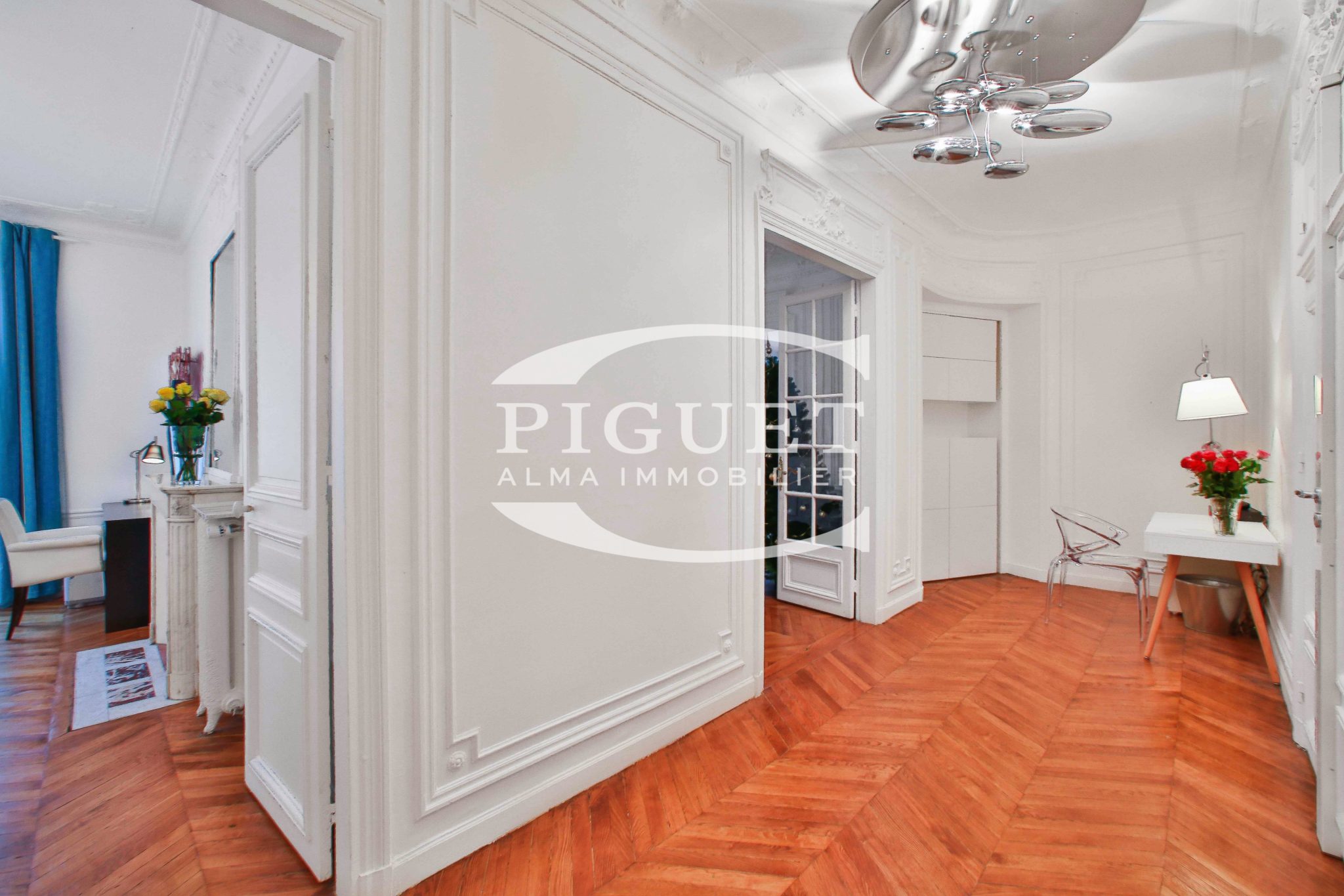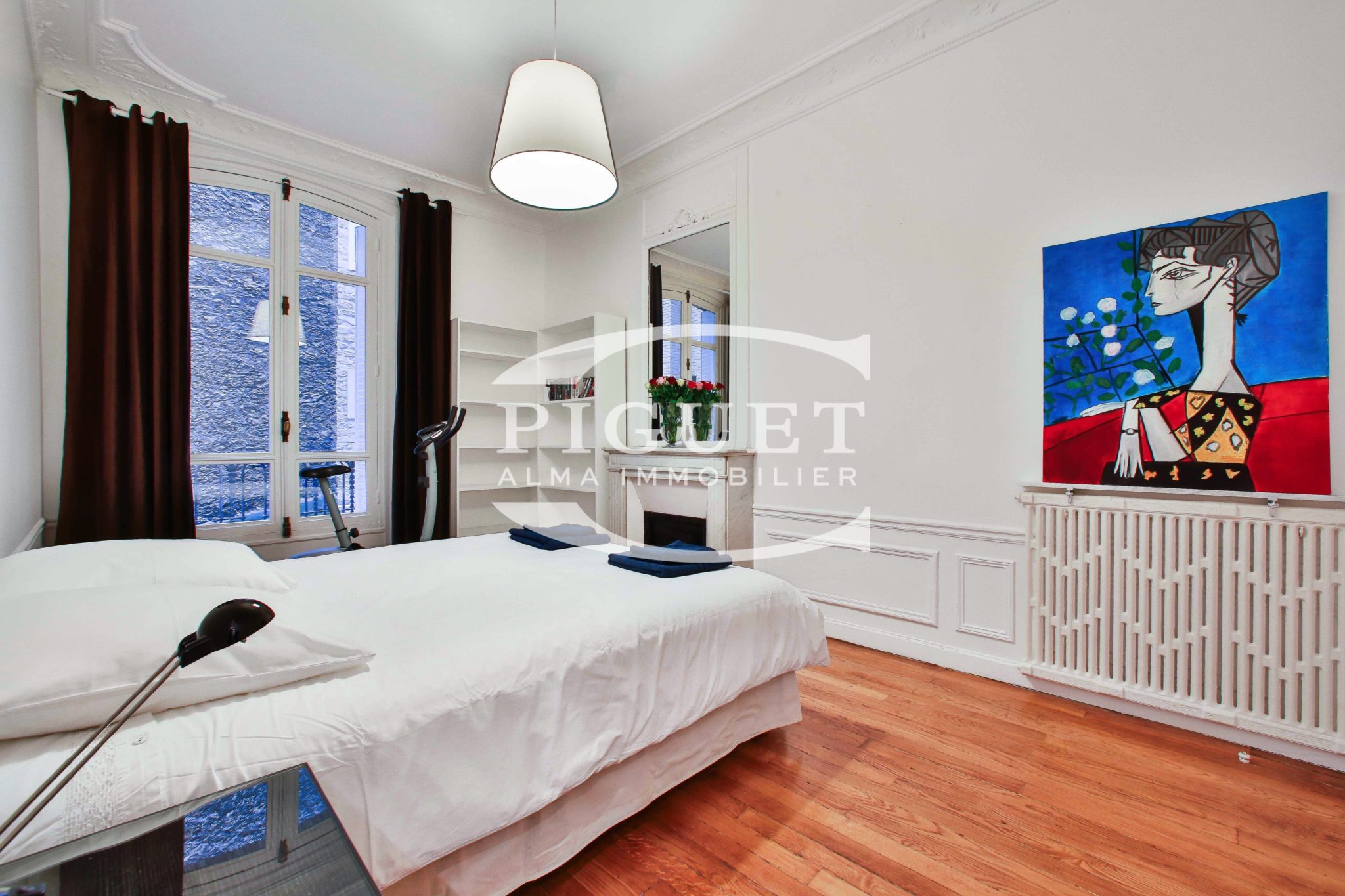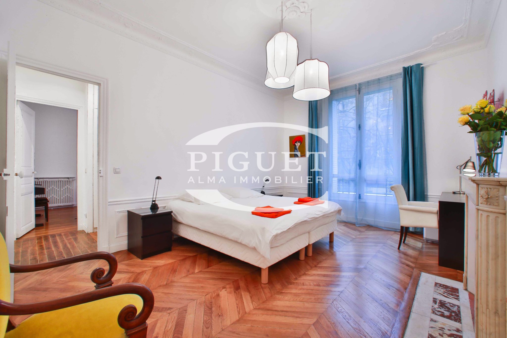 A proximité du Champ de Mars, au 1ER étage d’un très bel immeuble en pierre de taille du début du siècle dernier – un magnifique appartement entièrement refait de 5 pièces offrant de belles prestations, exposé Ouest, parquet, moulures, et cheminée, au calme le plus complet, plan fonctionnel.