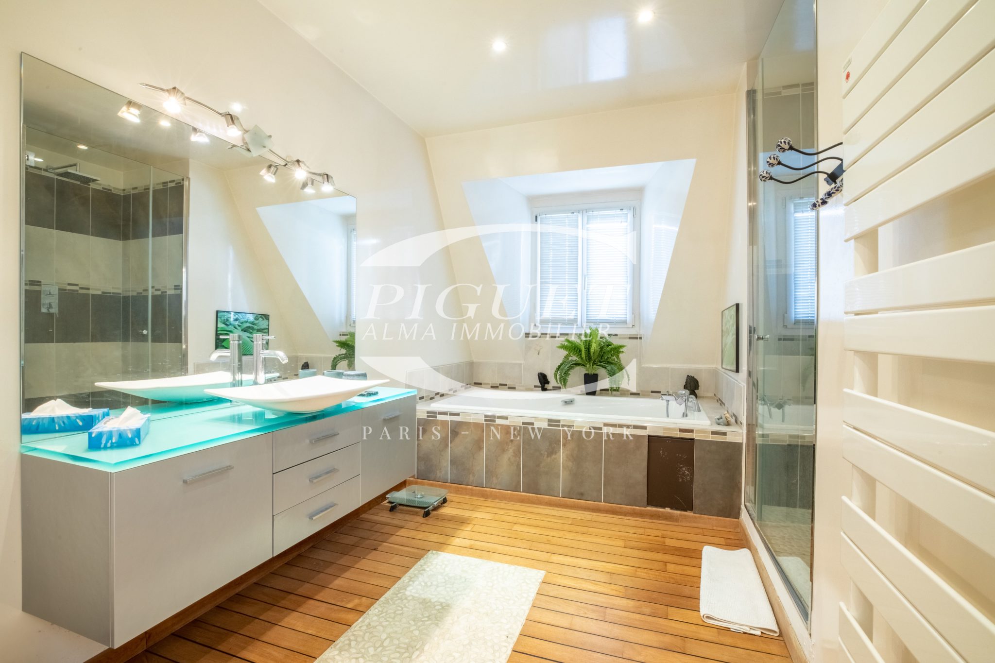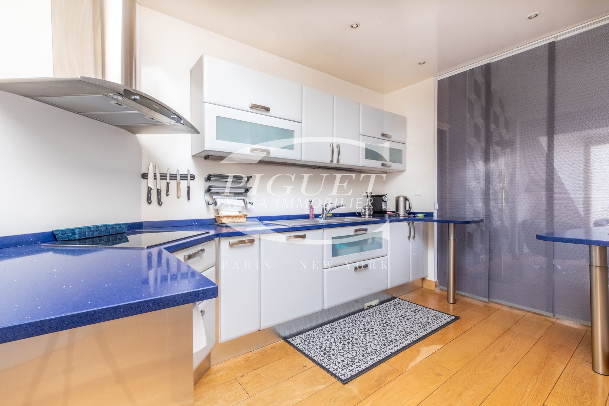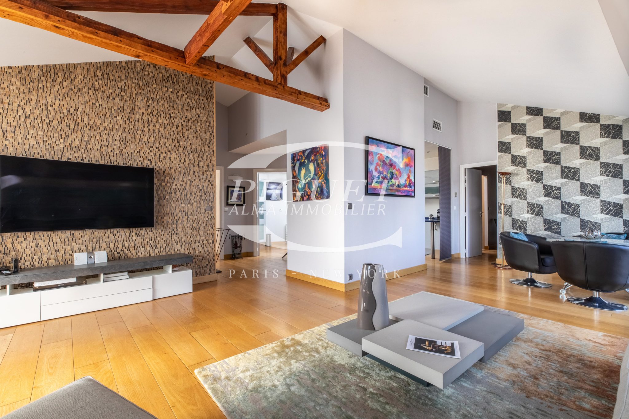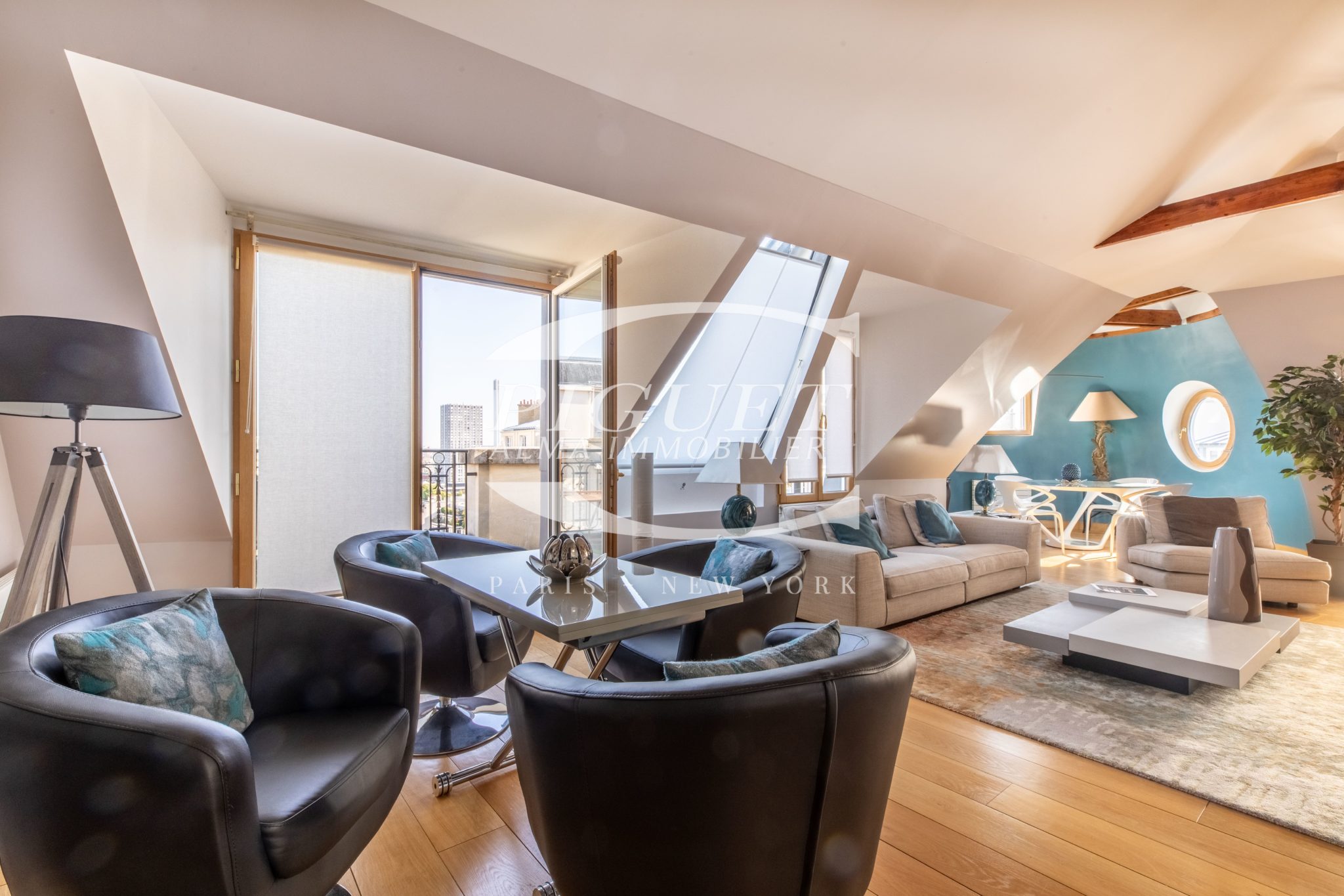 CATHERINE PIGUET vous invite à venir découvrir au 5éme et dernier étage d’un immeuble haussmannien en pierre de taille ,construit en 1910,un magnifique appartement de 5 pièces traité en loft, un salon en rotonde bénéficiant de 2 petites terrasses de plain pied sans vis-à-vis, avec une vue Tour Eiffel, Seine, cet appartement est traversant exposé EST/OUEST, très lumineux et ensoleillé., parquet, poutres apparentes, cheminées. 01.40.70.95.10