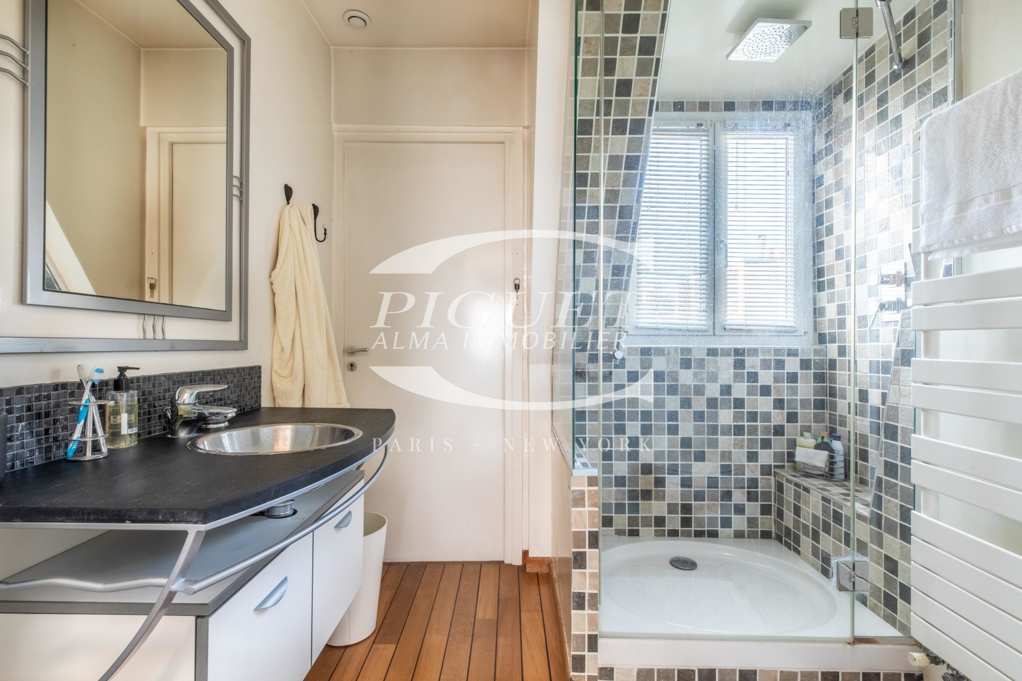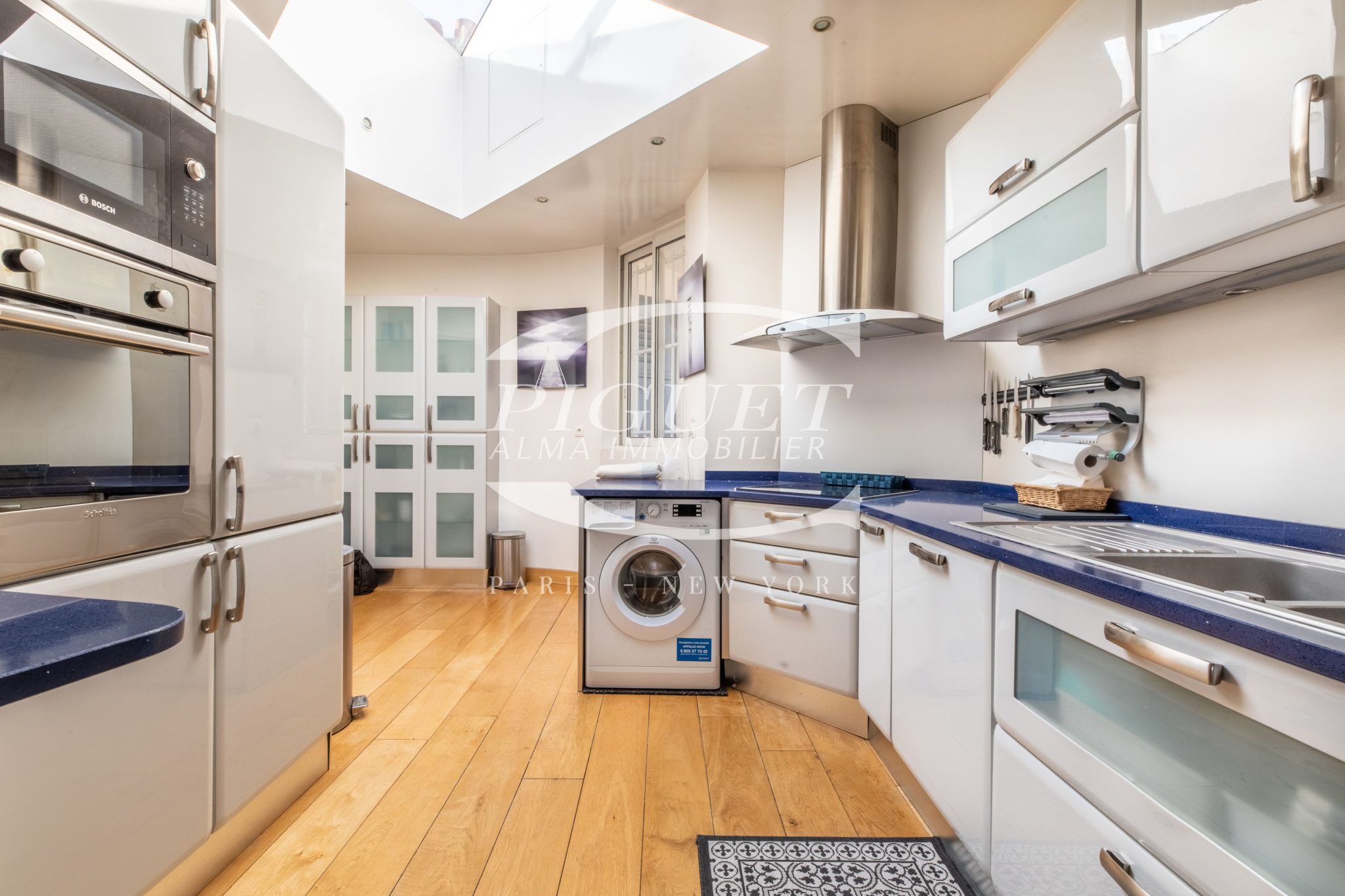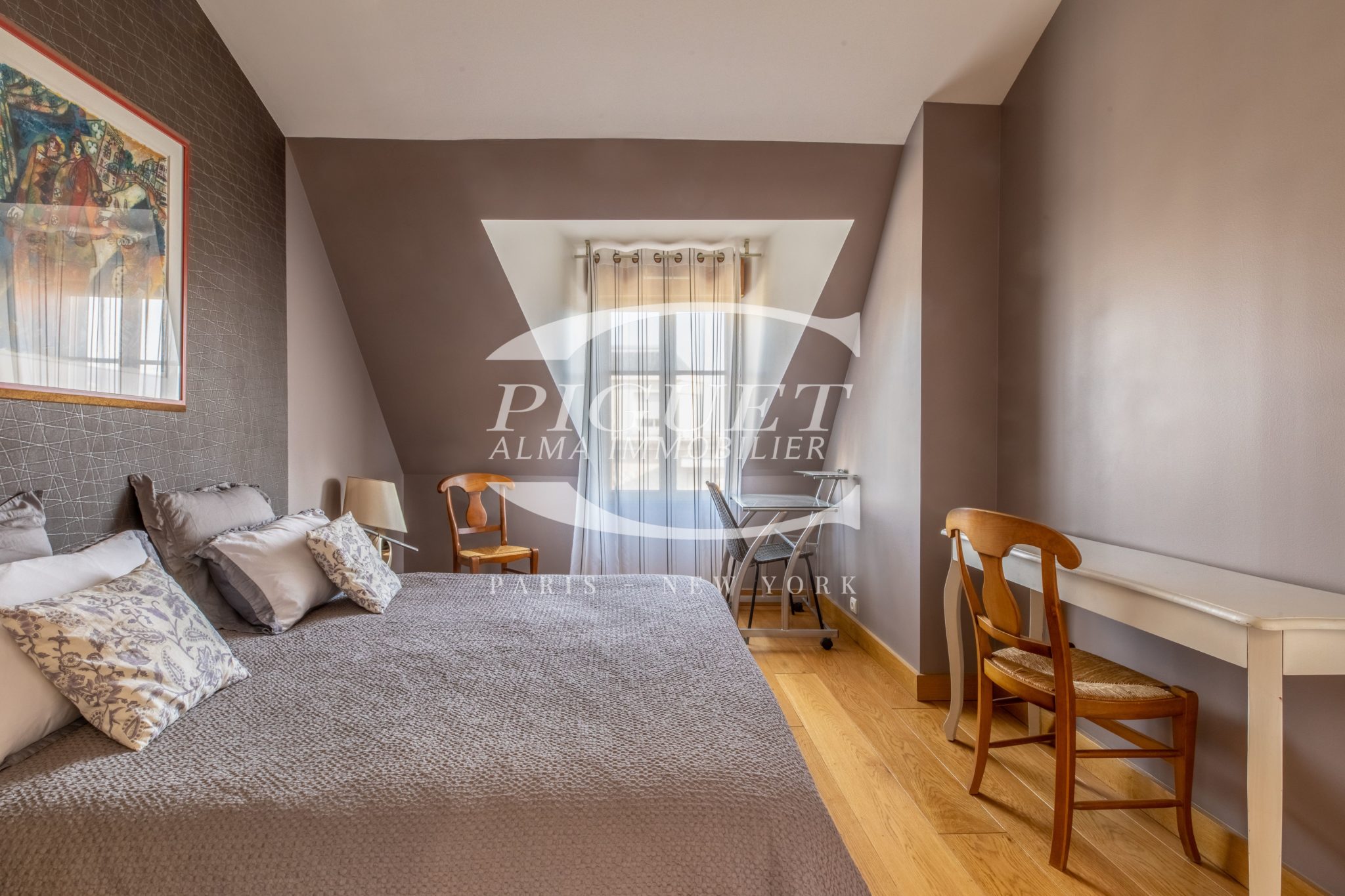 CATHERINE PIGUET invites you to discover the 5th and last floor of a Haussmann building in stone, built in 1910,a beautiful 5-room apartment treated in loft benefiting from 2 small terraces on one level without opposite, with a view of the Eiffel Tower, Seine, this apartment is crossing exposed EAST/ WEST, very bright and sunny. , parquet flooring, exposed beams, fireplaces. 01.40.70.95.10