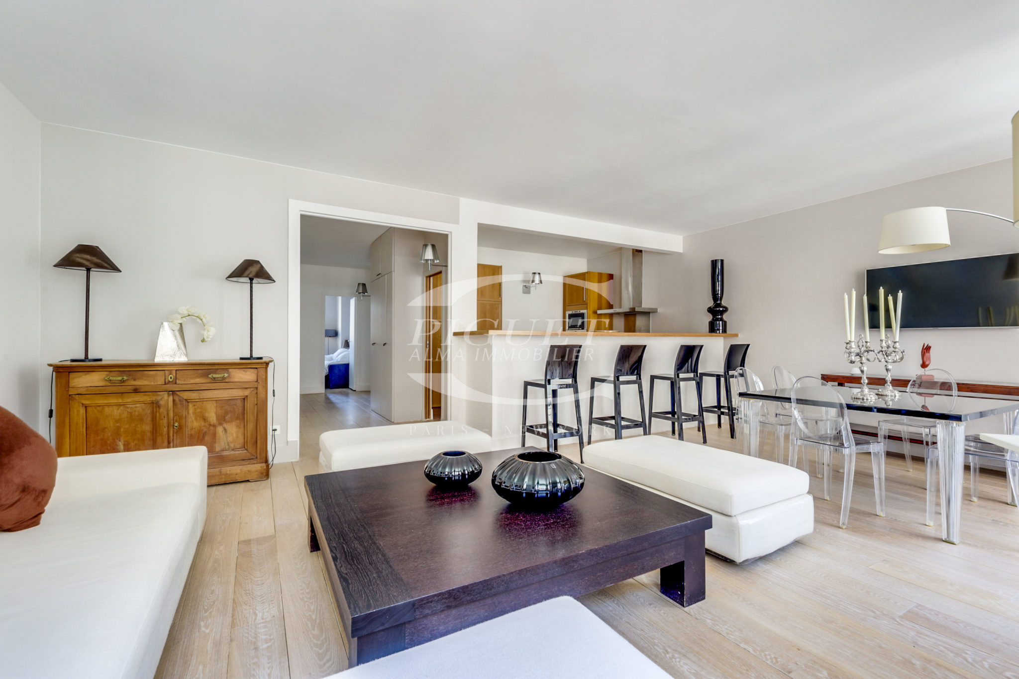 CATHERINE PIGUET vous invite à découvrir un magnifique appartement de 4 pièces entièrement restauré dans des matériaux de grande qualité (Parquet en chêne à larges lattes dans tout l’appartement),situé proche de l’Église américaine et à 50M du pont de l’ALMA au 4ème étage dans un immeuble de standing construit en 1928 de style Art déco, la réception a été traitée dans un esprit “loft ” avec un bow-window, permettant une vue dégagée sur la Seine, il est traversant avec une exposition sud/ouest et calme, les chambres donnent sur une grande cour lumineuse. Le plan est compact. Situé à deux pas de la rue Saint Dominique et du quartier Gros Caillou où se trouvent tous les commerçants ainsi que les meilleures écoles parisiennes (La Rochefoucauld, l’université Américaine). CET APPARTEMENT A FAIT L’OBJET D’UNE LUXUEUSE RENOVATION. +33.6.07.43.81.80