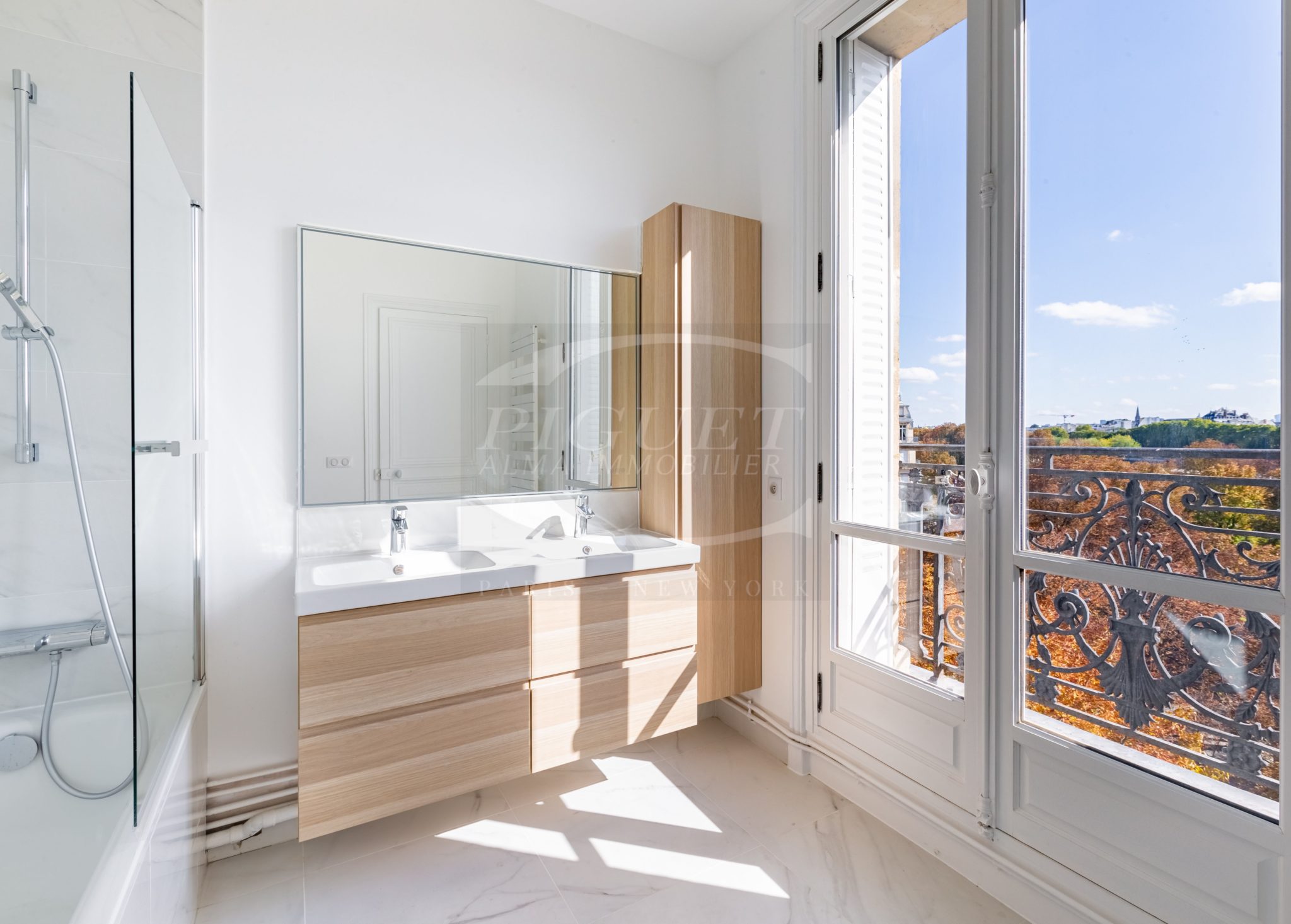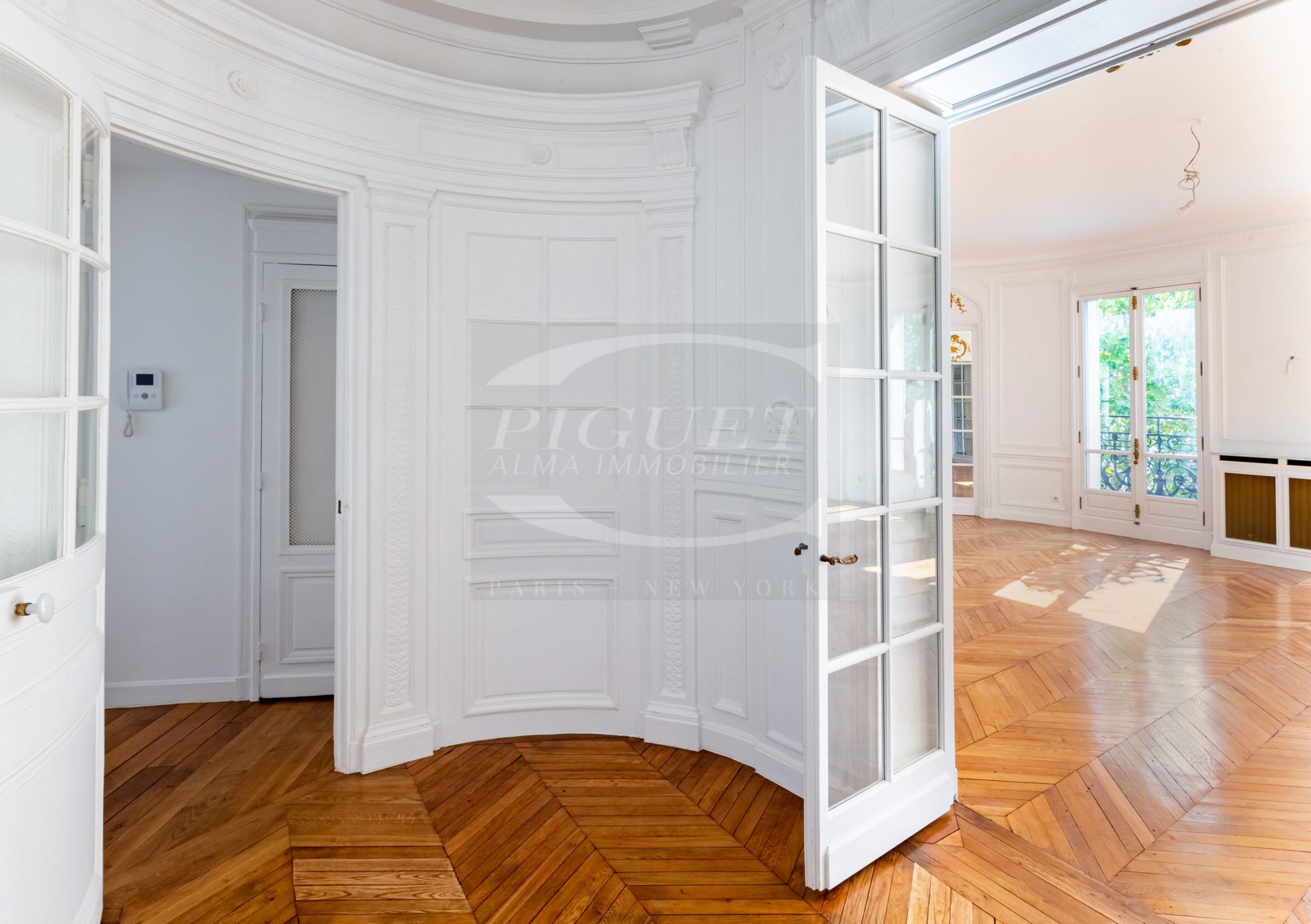 CATHERINE PIGUET opens the doors of a 4-room magnificent apartment facing the Eiffel Tower, without any vis-à-vis, south exposure, enjoying splendid volumes 3M40 of height under ceiling, the brightness is exceptional. This apartment exudes a lot of charm with its rotunda reception; its period moldings and Versailles parquet floor, it has just been the subject of a total renovation of very high quality. air-conditioned
