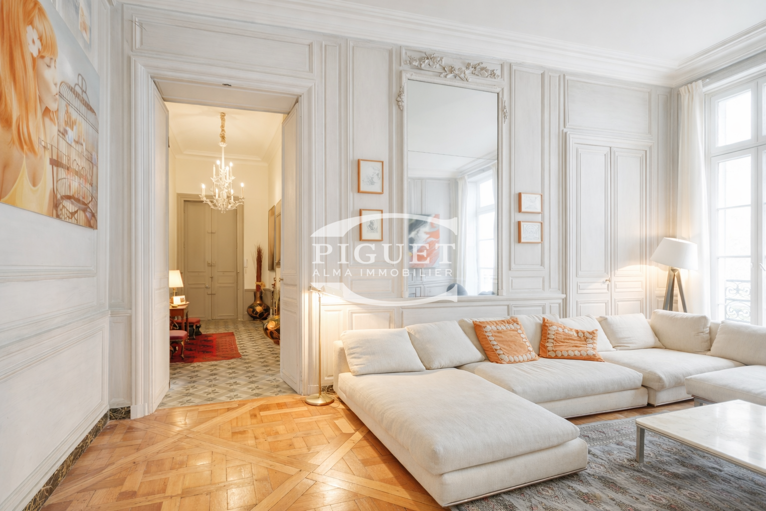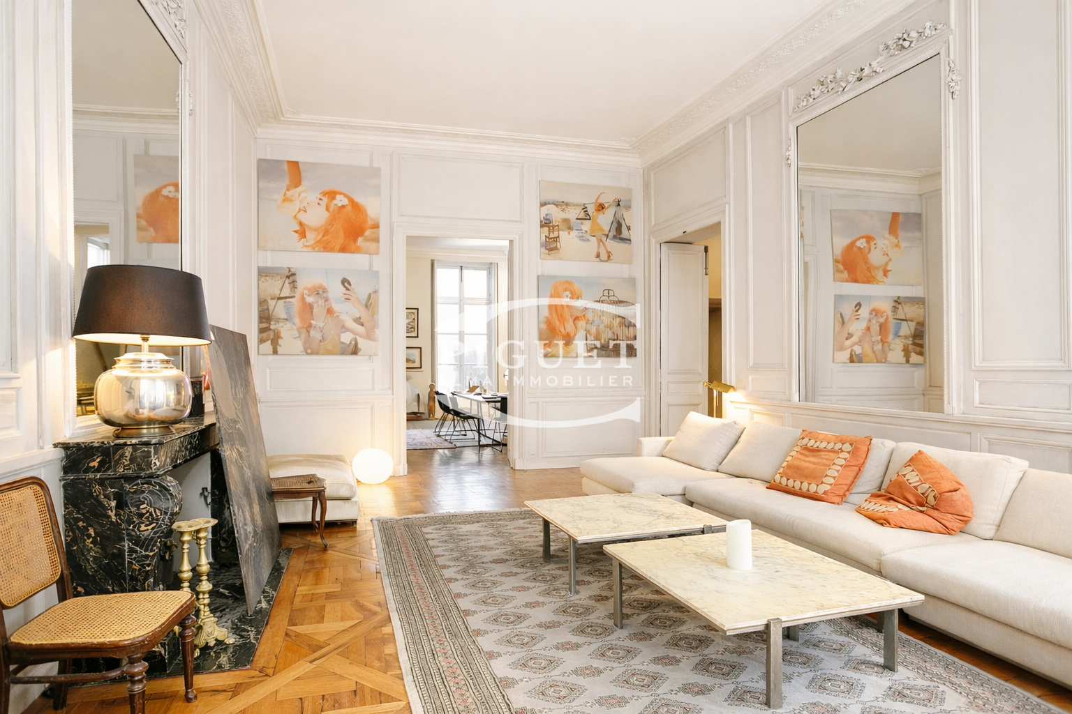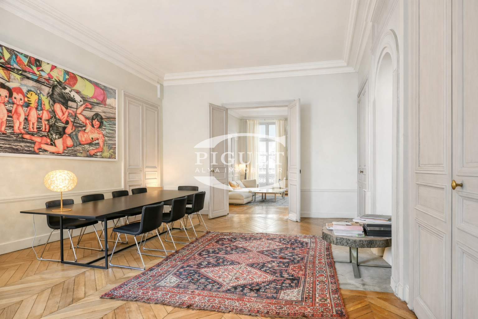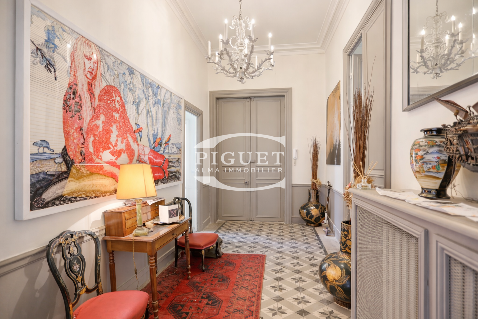 CATHERINE PIGUET invites you to discover, on the noble floor of an 18th-century former private mansion, set between courtyard and garden, a sumptuous reception apartment entirely renovated using exceptional materials, while preserving the full authenticity and historic character of the property.
