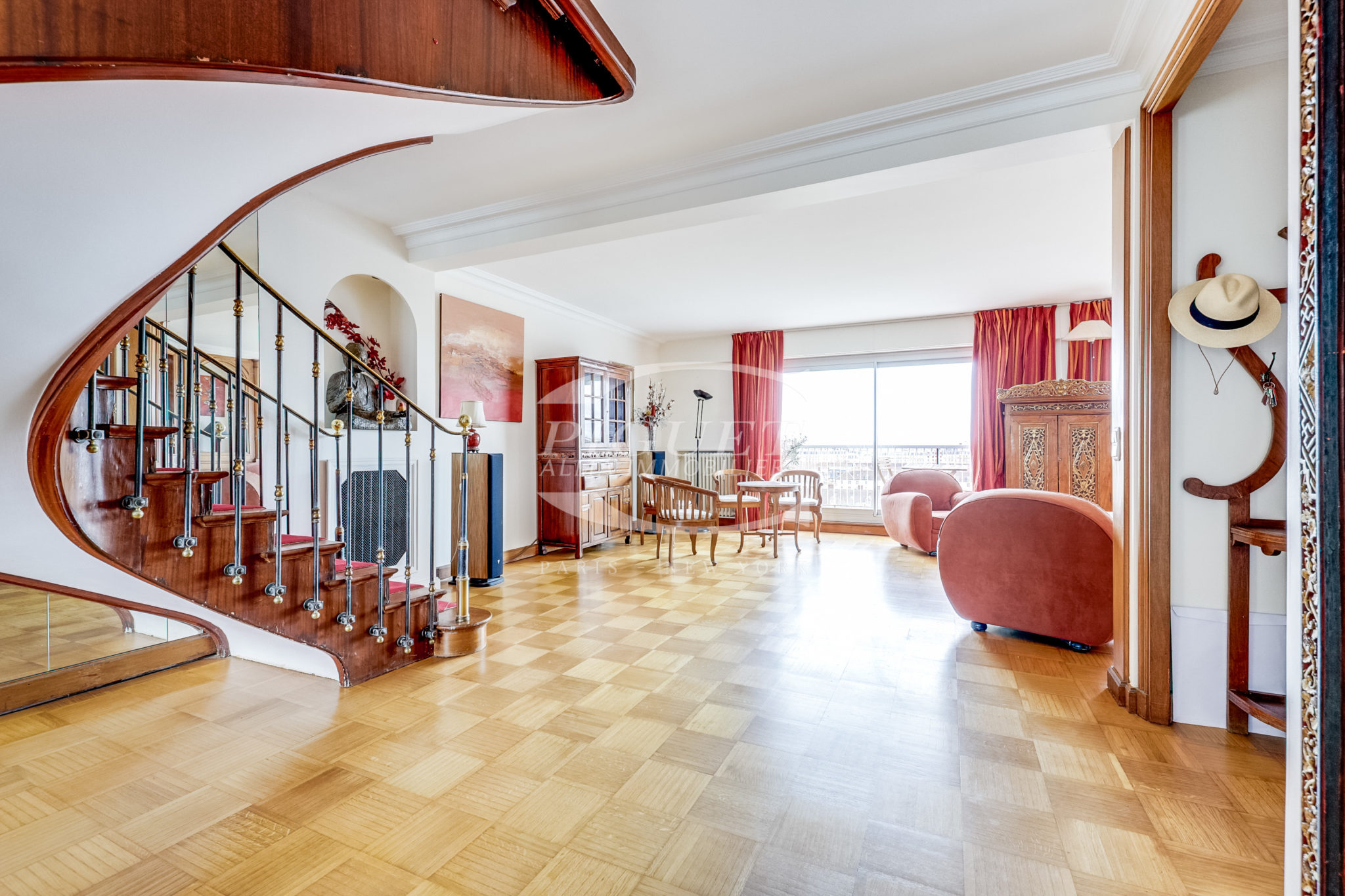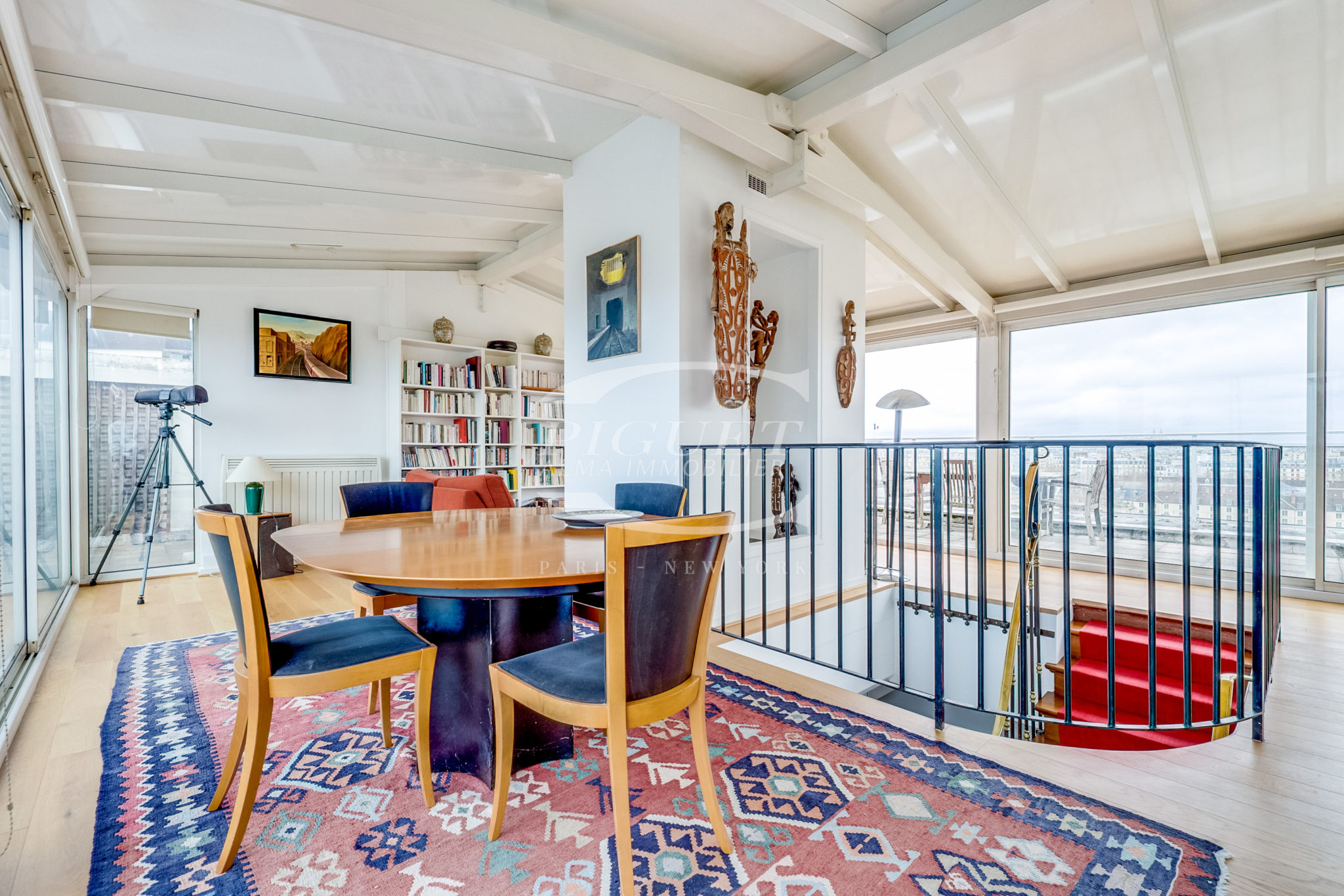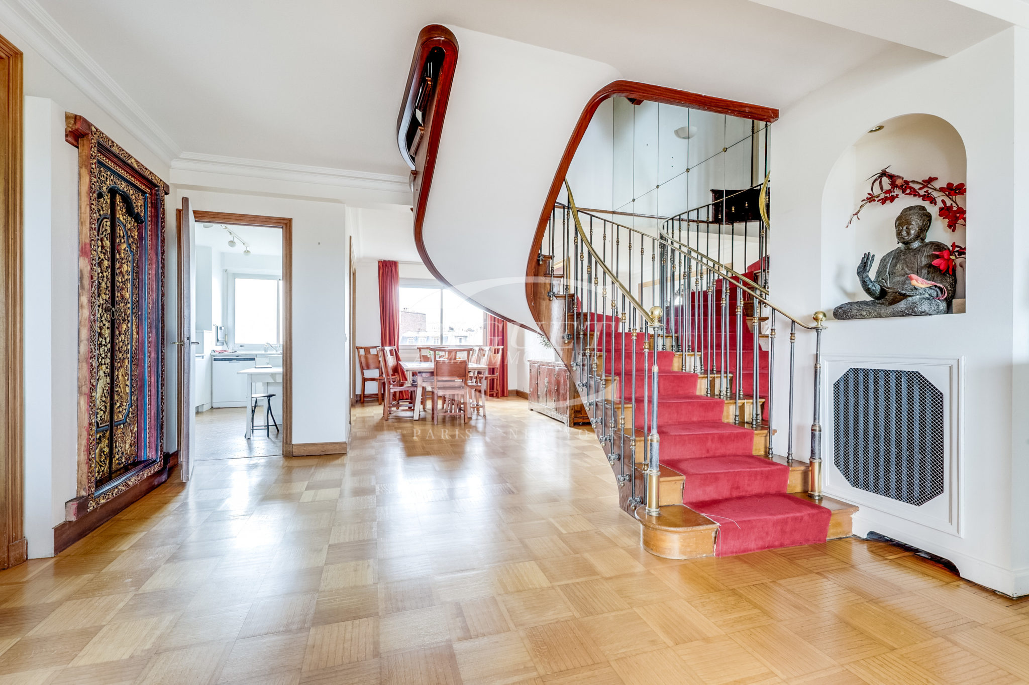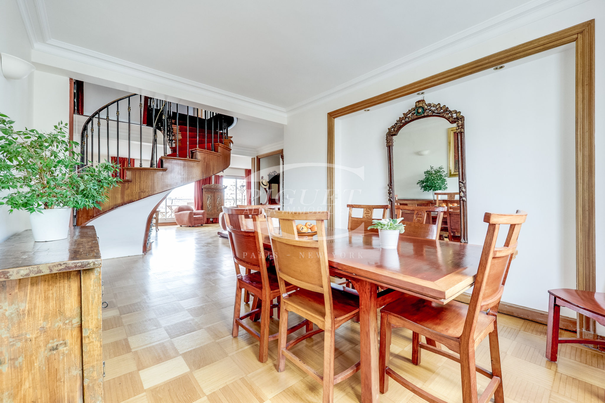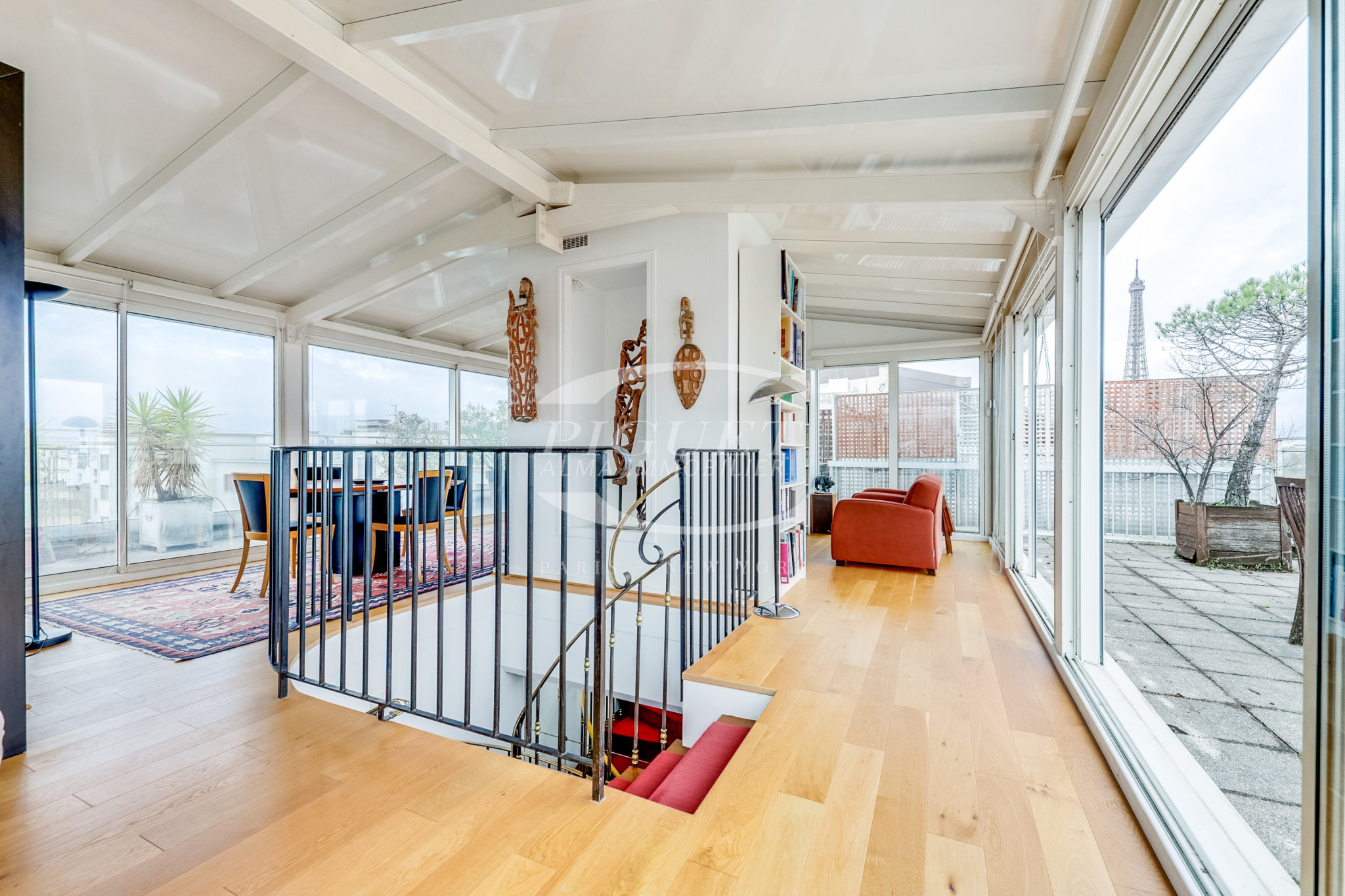 This exceptional property features, on the top floor, a winter garden opening onto a beautifully appointed terrace with a jacuzzi, offering a breathtaking panoramic view of Paris’s most iconic landmarks.