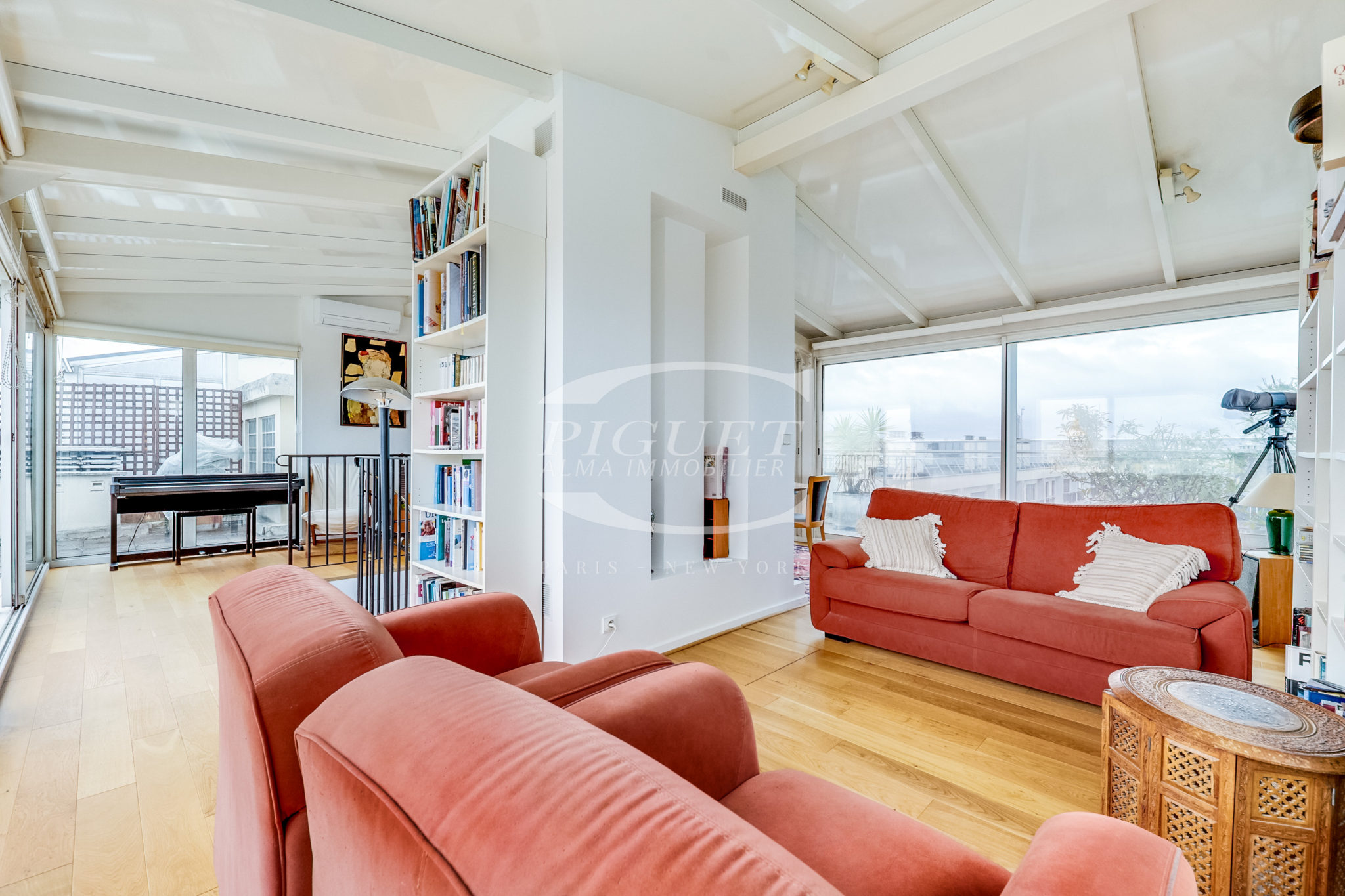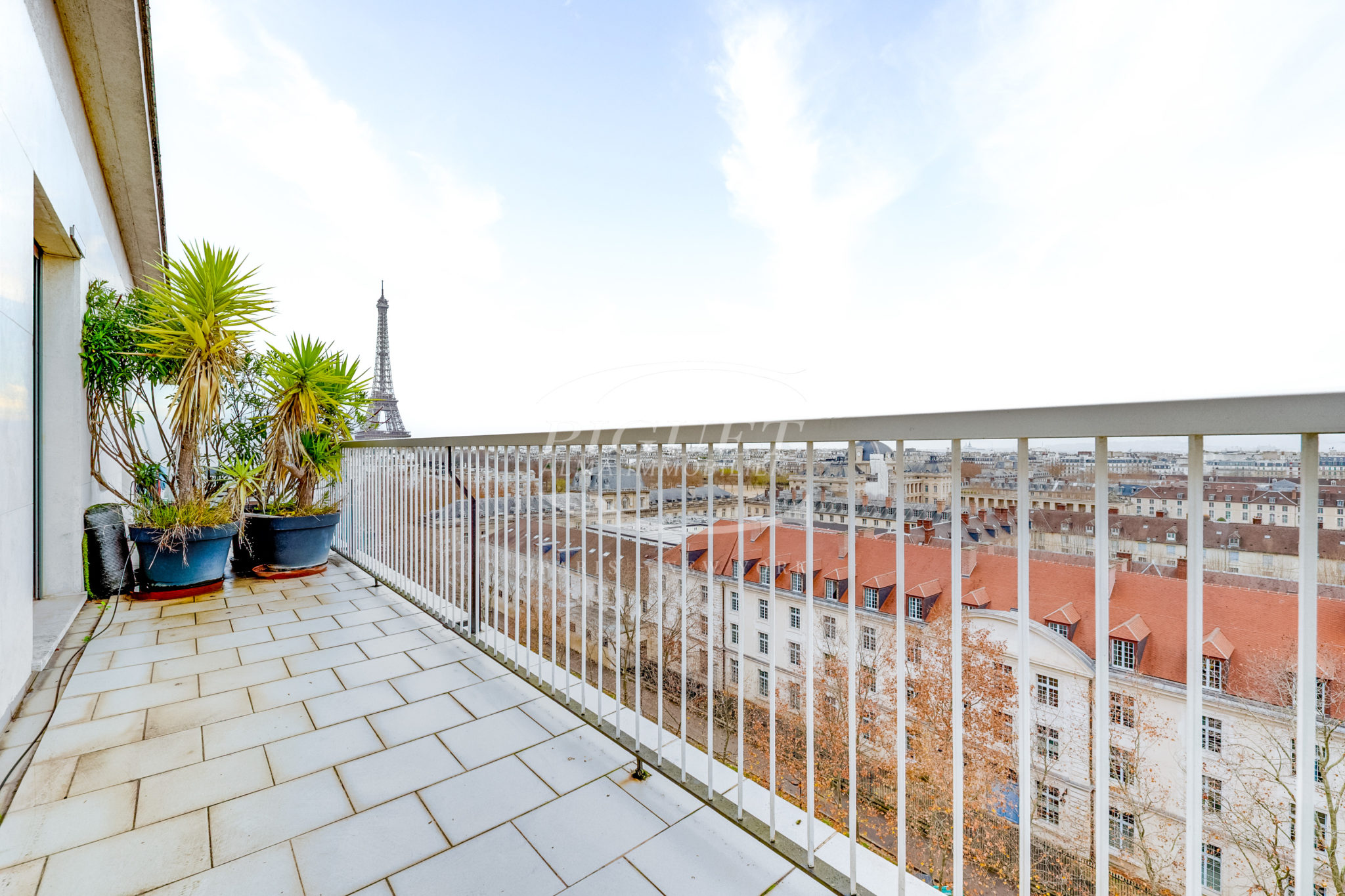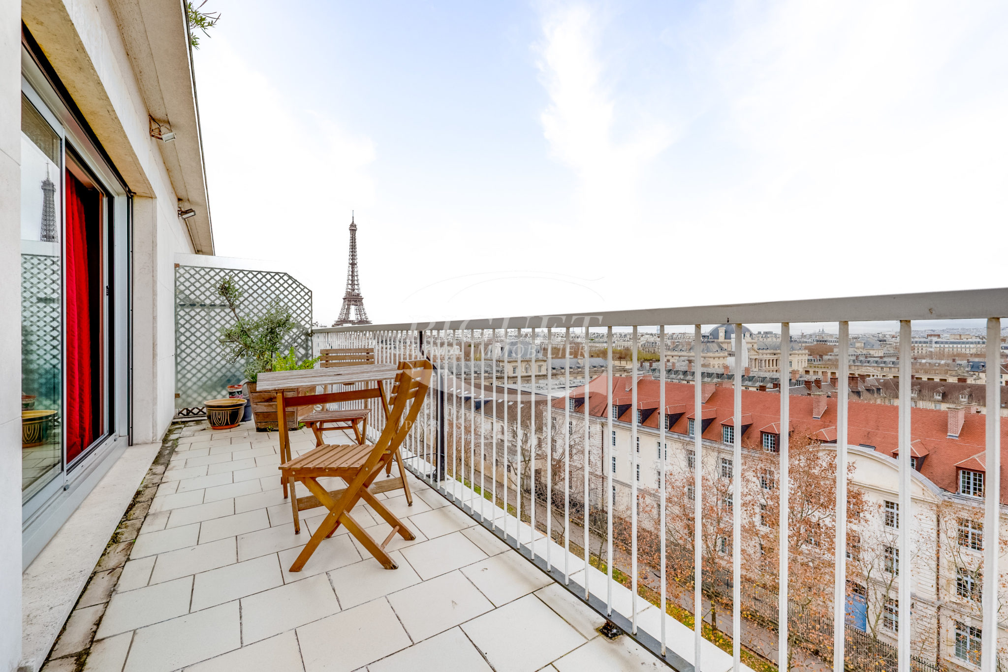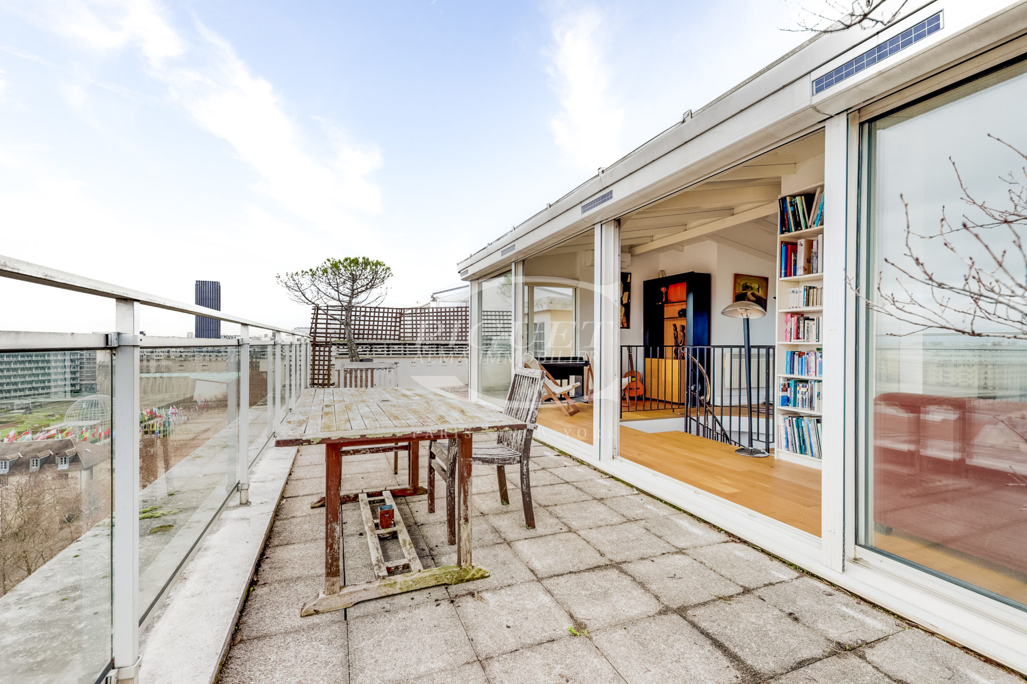 Ce bien d’exception bénéficie, au dernier étage, d’un jardin d’hiver ouvrant sur une terrasse aménagée avec jacuzzi, offrant une vue panoramique imprenable sur l’ensemble des monuments emblématiques de Paris.
